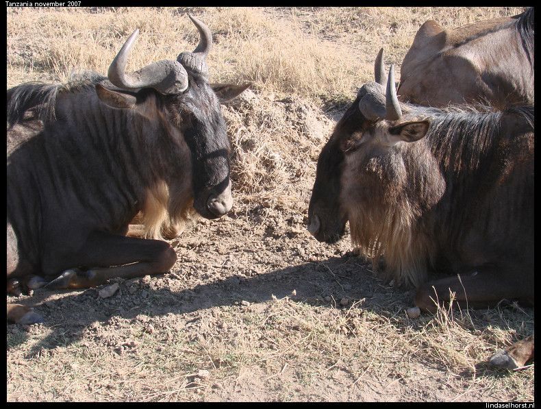 Vandaag de hele dag in de Serengeti rondgereden. Om 8.00u reden we weg bij de lodge, als eerste zagen we een kudde impala’s, goh wat verrassend, haha. We reden rustig door en ineens spotte Ton een leeuw, hup nu kwam de jeep van Julio weer achteruit gereden. Weer zagen we alleen zijn manen en heel even de leeuwin die 2x heen en weer liep en toen weer ging liggen. We waren nu wel iets dichterbij dan gister, maar het punt zit m in het hoge gras waardoor we niet veel zien, maar wel goed gespot! Genietend van de eindeloze vlaktes zagen we een hoop gieren in de lucht en in de bomen, wachtend op een lekker maaltje. In de verte zagen we een kudde wildebeesten (gnoes). We kwamen steeds dichterbij en ineens zagen we er honderden en misschien wel duizenden de weg oversteken en een lang lint vormen. We zaten midden in de migratie, geweldig!! Knorrend en rennend kwamen ze langs ons heen, op weg naar het vertrekpunt waar vandaan ze massaal naar de Masai Mara zullen trekken. Super dat we dit zien, echt mooi! Ondertussen zagen we al een aantal jeeps zich in de verte verzamelen, er zal wel een predator gesignaleerd zijn. En jawel, 2 leeuwinnen in een boom, luierend op een tak! Wat geweldig mooi zeg, boomklimmende leeuwen. We hebben een tijdje staan kijken maar konden niet dichterbij komen, de andere jeep stond er beter voor en Keith heeft een paar foto’s voor me gemaakt, thank you! Even verderop zagen we een aantal hippo’s in een poeltje liggen en op de achtergrond een olifant lopen, geinig gezicht. Ook kwamen we een grote kudde olifanten tegen die zich samendrong rondom een boom, met een hoop kleintjes erbij. Zo mooi om dit allemaal van dichtbij te zien. Aan de overkant stonden nog twee mannetjes olifanten te eten. En ons geluk kon niet op, een luipaard in de boom. In zo’n gave boom met allemaal kronkelende takken lag ook dit luipaard heerlijk te luieren en konden wij hem van een flinke afstand bewonderen, echt een supermooi beest. Een tijdje later zagen we weer een rijtje jeeps staan, ze hadden een cheeta gespot. Wat een geluk hebben we toch, we zagen hem lopen door het hoge struikgewas en zagen hem verdwijnen onder een boom waarna we hem niet meer zagen. Vol enthousiasme reden we naar de lunchplek waar we omringd werden door klipdassen en vogels. We moesten echt af en toe onze benen omhoog doen, want ze walsten gewoon door. Ook zagen we hier onze enige mongoose van deze reis. Samen met Ton nog de walking trail gelopen en van een mooi uitzicht genoten. We vertrokken weer en zagen een aantal topi’s. Bij een andere poel vele hippo’s in het water en in een boompje vlakbij twee mooi gekleurde lovebirds. Bij een andere poel zagen we twee krokodillen aan komen zwemmen, ze waren aan het paren, geweldig! Echt genieten zo langs de waterpoel. Later zagen we ook nog wat etende giraffen en zebra’s, ze zijn beiden erg mooi, net of ze gebodypaint zijn. We kwamen weer op de vlaktes terecht waar we de bekende rotsblokken weer in het vizier kregen. Bij elke rots speurden we naar leeuwen. En jawel, bij de derde rots was het raak. Bovenop een leeuwin die wegdook toen wij stil gingen staan. We hadden het idee dat er bovenop nog veel meer waren dan wij konden zien en we besloten nog even te wachten. En ja, daar kwam kleine Simba naar beneden en ging ons vanaf een richel zitten bekijken! Gaaf hoor, echt Simba op Pride Rock uit de Lion King. Met een flink gangetje reden we rond 15.30u terug naar de lodge. Het was erg warm geworden en er zaten veel vliegen in de auto. Onderweg zagen we veel blauwe doeken hangen, welke zijn opgehangen om de Tsee tsee vlieg te vangen welke de beruchte slaapziekte overbrengt. We kwamen nog een etende giraf, een buffel en een dikdik tegen, waarna we om 16.00u terug bij de logde waren. We hebben snel een duik genomen in het koude zwembad, maar het was goed om alle stof eraf te spoelen. Toen nog even van de zon genoten om om 18.00u na zonsondergang werd het toch echt te koud en vertrokken we richting warme douche. Vanavond hadden we geen buffet, maar een menu. We hebben 5 gangen gegeten binnen 5 kwartier, dat is toch ook wat he. Maar het was wel erg lekker. Nog koffie gedronken in de bar en toen vroeg naar bed, speuren is vermoeiend!