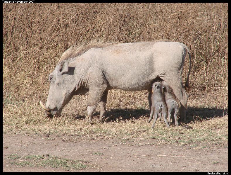 Op tijd ontbeten en stipt om 8.00u reden we richting Lake Manyara. Bij de ingang van het park werden we opgewacht door tientallen baboons. Eenmaal in het park werden we omringd door wel 1000 kleuren groen en vele vele baboons! Wat een ontzettend mooi en vooral groen park, het lijkt het tropische regenwoud van Ecuador wel. We zagen 2 mannetjes olifanten van een behoorlijke afstand en wederom baboons, vele soorten vogels, warthogs en impala’s. Na zo’n 2,5uur in het park gereden te hebben, reden we richting een picnic-place voor een sanitaire stop, maar vlak ervoor zagen we het schuwe luipaard hoog in een boom zitten. Wow, wat gaaf! Hij ging nog een paar keer verzitten en leek zich niet echt aan ons te storen, nu stonden we ook echt wel een eindje weg maar toch. Bij de stop een korte plaspauze en weer door. We kwamen weer langs het luipaard en hij lag nog steeds relaxt om zich heen te kijken. We kwamen langs de hippo-pool waar we een hoop ogen en oren boven het water zagen uitsteken en dat tussen allerlei soorten vogels. Om 12.00u waren we weer terug voor de lunch en om 13.00u vertrokken we naar de Serengeti. Onderweg zijn we alle kanten opgestuiterd door het slechte wegdek, echt ongelofelijk. Maar we hebben mooie dingen gezien; impala’s, warthogs, struisvogels, zebra’s en toen we binnen de grenzen van het park waren, zagen we nog een aantal gieren genieten van een kill. Dat was een geinig gezicht, allemaal stonden ze te wachten tot de grote baas uitgegeten was en toen de baas met veel vertoon wegliep, stormde de groep en op af en vocht om de laatste stukjes vlies, huid en haar, geweldig!  Inmiddels waren wij al verder gereden tot we werden teruggeroepen door de andere jeep van Julio. Ze hadden een leeuw gespot. Wij als een gek weer terug en het enige wat we zagen waren een heleboel manen, meer liet hij niet zien, jammer! Het gras was te hoog en hij lag te ver weg voor een mooie blik op z’n kop en lijf. Maar even later zagen we twee leeuwinnen lekker luieren in de zon, bovenop een groot rotsblok. Verder nog vele impala’s en wildebeesten gezien en nog een paar warthogs. En nog een gevlekte hyena en een black backed jackal, maar we konden niet te lang blijven staan, want we moesten voor het donker binnen zijn. Toen kwamen we een grote groep olifanten tegen, wow! En zo dichtbij! Opeens zeker te dichtbij want er begon er een te tetteren en met zijn kop te schudden, wegwezen! Toen ze voorbij waren gingen we volgas naar de lodge, waar we prachtig uitkeken over de eindeloze vlaktes. Het buffet smaakte weer goed, helaas eten we nergens plaatslijk wild. De vergunning daarvoor schijnt erg duur te zijn, helaas. Na het eten werden Ri en ik uitgenodigd door Keith, Cory en Ryan om gezellig wat te drinken in de bar, we hebben leuk gekletst. Zij komen uit St Louis en verhuizen komende maand alledrie naar New York, kijk, daar hebben we wat aan ;-). Om 23.30u liggen we in bed en maken ons klaar voor een full day game drive van morgen in de Serengeti.
