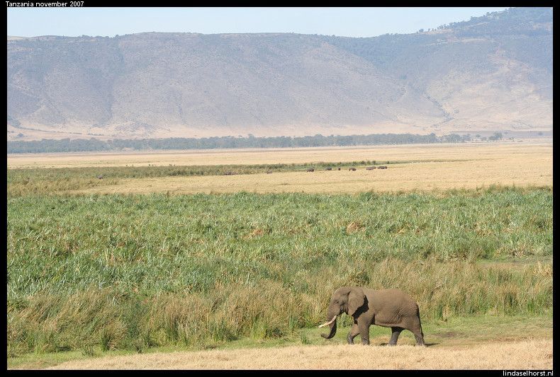 Lekker geslapen en ontbeten. Het is nog steeds erg koud en we stapten snel de jeeps in. De weg de krater uit was een stuk(je) beter dan de heenweg, gelukkig. Eenmaal uit het park werd het een asfaltweg en kregen we een mooi uitzicht over de nog steeds groene omgeving. Veel dorpjes en Masai lopend met hun koeien of geiten langs de weg. Rond het middaguur reden we Tarangire NP binnen en zagen we een mooi park met heel veel baobabbomen en een grote troep olifanten met kleintjes etend langs de weg. We zagen veel kapot gevreten bomen, zowel door olifanten als door termieten. We stopten bij een view-point waar we mooi uitzicht hadden over de vallei met een drooggevallen rivier. In de lunch kregen we een lunch en maakten we ons klaar om te zwemmen, maar helaas de zon verdween en het werd te koud. Toen hebben we de Amerikanen leren hartenjagen, was leuk. Om 16.00u vertrokken we voor onze laatste gamedrive. We zagen twee etende giraffen, gave beesten zijn dat toch. Toen een groepje olifanten wat net de weg overgestoken was, helemaal onder de rode stof. Even verderop weer een grote troep olifanten, ook weer met kleintjes erbij. Een moeder met een kleintje stond op de weg en schudde een paar keer met haar kop, gooide met zand en tetterde naar ons. Ook rende ze nog een paar stappen in onze richting, ohoh, wegwezen! Klein stukje achteruit gereden en weer staan kijken, ze bleef ons continu boos aankijken en liep de bosjes in. Daar tetterde ze nog een keer en hield ze ons in de gaten. Toen staken ze allemaal de weg over, wel 30 olifanten zagen we passeren. We reden een stukje verder en vlak achter de andere jeep was er weer een olifant boos geworden en schudde weer met de kop en nu tegen de achterste jeep, ze schrokken zich wezenloos, want de olifant was erg dichtbij en erg boos. Nu stonden wij voor ze en konden zij geen kant op, maar de chauffeurs hielden alles in de gaten. Wat een spektakel, echt geweldig! Toen alle olifanten de weg overgestoken waren, reden we weer een stukje verder en kwamen we weer een groep olifanten tegen. Ik maakte een foto waarbij ik de flits gebruikte en kreeg alweer getetter te horen en een boze blik, hmm ze zijn wel wat gepikeerd vandaag! Ook deze olifanten staken de weg over en hielden ons met boze blikken scherp in de gaten, brr wel heel gaaf maar ook een beetje eng was het wel. Later zagen we nog een paar dikdiks en een olifant in de verte. Langs de rivieroever zagen we nog twee leeuwinnen liggen, wat wel bijzonder was dat we die hier zagen; er zijn hier zoveel olifanten dat er bijna geen leeuwen zijn. Een schitterende sunset gezien, eindelijk! In de verte zagen we nog een groep olifanten en weer de leeuwinnen die lekker lagen te rollen in het zand. Terug in het hotel wat gedronken en elkaars foto’s bekeken, erg leuk om te zien hoe die jongens de ‘aanval’ van de olifant gezien hebben! Keith had een hele gave foto van de olifant op 3 meter afstand. Ook de foto’s uit Kenia heb ik nog gezien, daar hebben ze ook echt gave dingen beleefd, cheeta’s met een kill en een groepje neushoorns van heel dichtbij. De douche was lekker warm, het eten goed. In de bar hebben we gedronken, gekaart en gelachen. Het was een gezellige avond, tot in de late uurtjes…