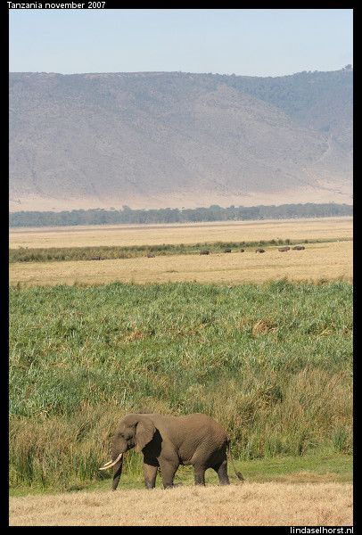 Lekker geslapen en ontbeten. Het is nog steeds erg koud en we stapten snel de jeeps in. De weg de krater uit was een stuk(je) beter dan de heenweg, gelukkig. Eenmaal uit het park werd het een asfaltweg en kregen we een mooi uitzicht over de nog steeds groene omgeving. Veel dorpjes en Masai lopend met hun koeien of geiten langs de weg. Rond het middaguur reden we Tarangire NP binnen en zagen we een mooi park met heel veel baobabbomen en een grote troep olifanten met kleintjes etend langs de weg. We zagen veel kapot gevreten bomen, zowel door olifanten als door termieten. We stopten bij een view-point waar we mooi uitzicht hadden over de vallei met een drooggevallen rivier. In de lunch kregen we een lunch en maakten we ons klaar om te zwemmen, maar helaas de zon verdween en het werd te koud. Toen hebben we de Amerikanen leren hartenjagen, was leuk. Om 16.00u vertrokken we voor onze laatste gamedrive. We zagen twee etende giraffen, gave beesten zijn dat toch. Toen een groepje olifanten wat net de weg overgestoken was, helemaal onder de rode stof. Even verderop weer een grote troep olifanten, ook weer met kleintjes erbij. Een moeder met een kleintje stond op de weg en schudde een paar keer met haar kop, gooide met zand en tetterde naar ons. Ook rende ze nog een paar stappen in onze richting, ohoh, wegwezen! Klein stukje achteruit gereden en weer staan kijken, ze bleef ons continu boos aankijken en liep de bosjes in. Daar tetterde ze nog een keer en hield ze ons in de gaten. Toen staken ze allemaal de weg over, wel 30 olifanten zagen we passeren. We reden een stukje verder en vlak achter de andere jeep was er weer een olifant boos geworden en schudde weer met de kop en nu tegen de achterste jeep, ze schrokken zich wezenloos, want de olifant was erg dichtbij en erg boos. Nu stonden wij voor ze en konden zij geen kant op, maar de chauffeurs hielden alles in de gaten. Wat een spektakel, echt geweldig! Toen alle olifanten de weg overgestoken waren, reden we weer een stukje verder en kwamen we weer een groep olifanten tegen. Ik maakte een foto waarbij ik de flits gebruikte en kreeg alweer getetter te horen en een boze blik, hmm ze zijn wel wat gepikeerd vandaag! Ook deze olifanten staken de weg over en hielden ons met boze blikken scherp in de gaten, brr wel heel gaaf maar ook een beetje eng was het wel. Later zagen we nog een paar dikdiks en een olifant in de verte. Langs de rivieroever zagen we nog twee leeuwinnen liggen, wat wel bijzonder was dat we die hier zagen; er zijn hier zoveel olifanten dat er bijna geen leeuwen zijn. Een schitterende sunset gezien, eindelijk! In de verte zagen we nog een groep olifanten en weer de leeuwinnen die lekker lagen te rollen in het zand. Terug in het hotel wat gedronken en elkaars foto’s bekeken, erg leuk om te zien hoe die jongens de ‘aanval’ van de olifant gezien hebben! Keith had een hele gave foto van de olifant op 3 meter afstand. Ook de foto’s uit Kenia heb ik nog gezien, daar hebben ze ook echt gave dingen beleefd, cheeta’s met een kill en een groepje neushoorns van heel dichtbij. De douche was lekker warm, het eten goed. In de bar hebben we gedronken, gekaart en gelachen. Het was een gezellige avond, tot in de late uurtjes…