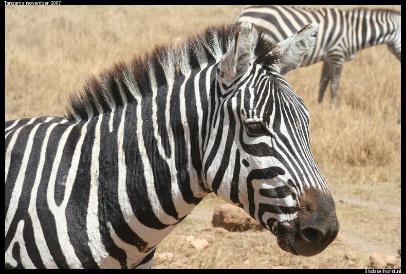 Vanmorgen wakker geworden van de wake up call om 7.00u. We hebben lekker geslapen onze eerste nacht. Heerlijke (koude) douche en om 7.30u ontbeten. Om 8.00u maakten we kennis met onze chauffeur / gids Mudi. We blijven de rest van de trip bij hem in de bus, wij vieren en Regina. Maar dat gaat allemaal helemaal passen in het 7 persoonsbusje die we tot onze beschikking hebben. Via een klein hobbelweggetje kwamen we via een lokale en drukke markt op de hoofdweg richting Arusha Ngurdoto Crater National Park. We genoten van het mooie landschap en de heerlijke geuren van Afrika. Helaas zagen we geen Mount Kilamanjaro door de bewolking, wel zagen we de Mount Meru. Direct na binnenkomst in het NP zagen we tientallen baboons, giraffen en zebra’s vlakbij de jeep. Onze eerste wild van deze reis! Na de nodige foto’s reden we via een ontzettend mooi en dichtbegroeid woud naar een uitkijkpunt over de krater. Heel erg mooi uitzicht met in de verte een heleboel baboons en een kudde buffels. Hmm, hier zou ik wel een dagje in de hangmat willen luieren, zoveel geluiden en zoveel te zien, wow! Hier zagen we ook de Eastern black en white Colabus (aap) welke alleen in dit park voorkomt binnen Tanzania. Ze zaten lekker in de bomen met hun grote witte pluimstaart heen en weer te zwiepen. Op weg door het park zagen we nog meer vergezichten, buffels, baboons, giraffen, warthogs en zebra’s. Onderweg ook nog in een klein museum gestopt waar we Ton met zijn hoofd in een hippo-bek hebben gelegd, haha dat was lachen! Na dit bezoek terug naar de lodge, lunchen, gewandeld door de tuin en kennisgemaakt met de rest van de groep, drie Amerikaanse jongens. Nu was onze groep compleet, 9 man over 2 jeeps verdeeld. Rond 14.00u vertrokken we richting Lake Manyara. Ondanks de mooie vergezichten viel ik halverwege de rit toch in slaap, echt ongelofelijk! Via de curioshop omhoog gereden naar ons hotel, op het topje van de berg. Prachtig uitzicht, hoewel het wederom niet helemaal helder weer was. Prachtige kamers met uitzicht op het meer en het park. Bij het zwembad hebben we genoten van het mooi uitzicht en de vele vogels rondom het water. Rond 18.00u begon het koud te worden en zijn we lekker warm gaan douchen. Om 22.30u liggen we in bed. Morgen gaan we op game drive en ’s middags 5 uur lang rijdend en vooral hobbelend naar de Serengeti!