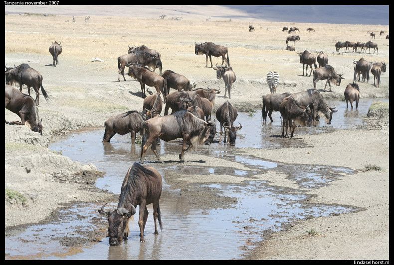 Vanmorgen om 8.00u zaten we weer in de jeep, op naar de laatste game drive in de Serengeti. De eerste tijd scheurden we overal langs totdat we een riviertje over moesten steken. Daar deden we drie keer over en aan de overkant van het meer zagen we links 4 leeuwinnen en rechts een heleboel wildebeesten. Helaas was er van beide kanten geen beweging en tuften wij verder. Nu zagen we nog meer wildebeesten bij elkaar en allemaal op weg naar de migratie, echt een overweldigend gezicht!! We hebben een tijdje tussen de duizenden wildebeesten rondgereden toen we weer om moesten keren naar het riviertje. Intussen waren de wildebeesten overgestoken en de leeuwinnen niet meer te zien. Wel zagen we een hoop gieren en een eenzame hyena die flink z’n best deed om alle gieren weg ta jagen, wat hem niet lukte in z’n eentje, het waren er teveel. Bij zo’n grote rots zagen we 2 jeeps staan, dat beloofde goed nieuws. En jawel, wat een geluk, 1 leeuw en 4 leeuwinnen waarvan er 1 zelfs zwanger was! Ze lagen (wederom) rustig te liggen, af en toe ging er een pootje of een kop omhoog maar dat was dan ook wel waar het bij bleef. Toen door naar de uitgang van het NP welke meteen over ging in het Ngorongoro NP. Bij de ingang konden we weer van een opperbest toilet genieten. Maar gelukkig ook hier een prachtig uitzicht over de vlaktes. Eenmaal terug bij de jeeps bleek er van de derde jeep de ventilator te zijn gesneuveld en moesten we die jeep achterlaten, de passagiers en de tassen werden over onze 2 jeeps. Na een tijdje door ‘skelettenland’ te hebben gereden, stopten we bij 1 duin ergens in de middle of nowhere. Weer pech, maar nu met de jeep van Julio, een lekke band. We zijn het duin opgeklommen, gezellig gekletst en een paar leuke foto’s gemaakt. Toen weer op weg en nog geen 20minuten later, weer de jeeps aan de kant, weer een lekke band! Dus weer uit de jeeps, kletsen in de zon, nieuwe band eronder, maar deze was ook al zacht, nou ja, op hoop van zegen. Zodra we hier uitstapten kwam er een Masai vrouw op ons af met 2 ezels, ze vroeg geld in ruil voor foto’s. Het land waar we ons nu bevinden is de ‘gorge’ waar de eerste mens gevonden (homo Sapiens) is en wordt alleen bewoond door de Masai, het is te dor en te droog om goed bewoond te kunnen worden. We reden na het verwisselen van de band door naar een uitkijkpunt over de vallei en hadden ook hier weer een schitterend uitzicht en een hoop lol met de amerikanen! De chauffeurs waren weer met de auto’s bezig en na een uurtje zat alles weer vast en konden we weer op pad. Nu gingen we door het lege landschap op weg naar een Masai-dorp. We werden verwelkomt met dans en zang en gingen in groepjes van 3 een hutje van binnen bekijken. Interessant hoor, we kregen uitleg over het leven van de Masai. Daarna nog een rondleiding door het dorpje en langs de plaatselijke school waar ze de ‘Jambo-song’ voor ons zongen. Toen ik begon te tellen in het engels, maakten zij het af, echt goed! Inmiddels had ik een klein ventje aan de hand wat me niet meer los liet, hoewel z’n moeder ons overal volgde. Nog steeds met het jochie aan de hand liepen we terug naar het dorp, terug naar de jeep en de volgende rit vol stof. Als de moeder het jochie niet had gepakt, was ie zo met ons mee gelopen. 20 minuten later kwamen we de chauffeur tegen die we eerder deze dag hadden achtergelaten met een kapotte ventilator. Hij stond nu weer stil met de nieuwe ventilator in zijn handen, dus wij weer stoppen, de chauffeurs haalden alle tools weer tevoorschijn en gingen weer al schreeuwend tegen elkaar aan de bak om de wagen te fiksen. Na 40minuten konden we weer op weg, want hij deed het weer. Hij wilde nog geen passagiers meenemen, die mochten in onze jeeps blijven. Nou, toen was de jeep van Julio weer aan de beurt, er was een slangetje los geschoten. We gaan lekker vandaag! Nieuw slangetje erin, weer wat geklus en gedoe en we konden weer op pad. Alleen onze jeep rijdt nog zonder problemen, als je het raam wat er steeds uitvalt niet mee rekent dan, haha. We vervolgden een stoffige weg en Mudi gaf vol gas omhoog en toen werd ik wel wat ziek, maar gelukkig was de afleiding van de prachtige uitzichten daar. In het hotel een koude handdoek, een drankje en de sleutel van een immens grote kamer met glazen serre met uitzicht op… een berg gras! Haha, geweldig! Lekker wat gedronken in de bar, koud gedoucht, alle apparatuur weer opgeladen en richting het diner. Goed buffet en toen weer naar de bar met de Amerikaanse jongens. We hebben veel gekletst en gelachen om ons belachelijke engels en een potje gekaart. Toen de bar dichtging hebben we op hun kamer ze leren meppen, haha! Toen nog een spelletje bullshit gespeeld waarbij ik wonderbaarlijk won zonder precies te weten hoe ik dat gedaan had, was het tijd om te slapen. Morgen naar de krater!
