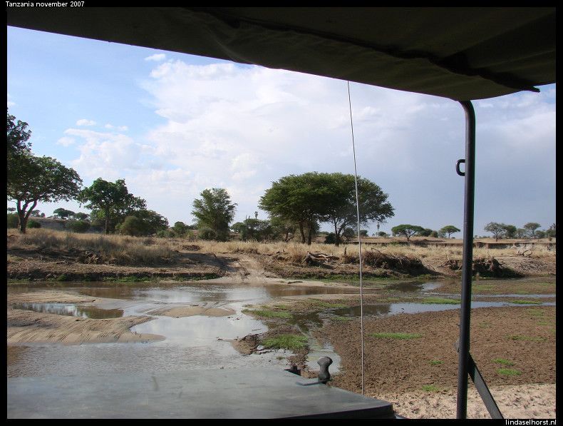 Lekker geslapen en ontbeten. Het is nog steeds erg koud en we stapten snel de jeeps in. De weg de krater uit was een stuk(je) beter dan de heenweg, gelukkig. Eenmaal uit het park werd het een asfaltweg en kregen we een mooi uitzicht over de nog steeds groene omgeving. Veel dorpjes en Masai lopend met hun koeien of geiten langs de weg. Rond het middaguur reden we Tarangire NP binnen en zagen we een mooi park met heel veel baobabbomen en een grote troep olifanten met kleintjes etend langs de weg. We zagen veel kapot gevreten bomen, zowel door olifanten als door termieten. We stopten bij een view-point waar we mooi uitzicht hadden over de vallei met een drooggevallen rivier. In de lunch kregen we een lunch en maakten we ons klaar om te zwemmen, maar helaas de zon verdween en het werd te koud. Toen hebben we de Amerikanen leren hartenjagen, was leuk. Om 16.00u vertrokken we voor onze laatste gamedrive. We zagen twee etende giraffen, gave beesten zijn dat toch. Toen een groepje olifanten wat net de weg overgestoken was, helemaal onder de rode stof. Even verderop weer een grote troep olifanten, ook weer met kleintjes erbij. Een moeder met een kleintje stond op de weg en schudde een paar keer met haar kop, gooide met zand en tetterde naar ons. Ook rende ze nog een paar stappen in onze richting, ohoh, wegwezen! Klein stukje achteruit gereden en weer staan kijken, ze bleef ons continu boos aankijken en liep de bosjes in. Daar tetterde ze nog een keer en hield ze ons in de gaten. Toen staken ze allemaal de weg over, wel 30 olifanten zagen we passeren. We reden een stukje verder en vlak achter de andere jeep was er weer een olifant boos geworden en schudde weer met de kop en nu tegen de achterste jeep, ze schrokken zich wezenloos, want de olifant was erg dichtbij en erg boos. Nu stonden wij voor ze en konden zij geen kant op, maar de chauffeurs hielden alles in de gaten. Wat een spektakel, echt geweldig! Toen alle olifanten de weg overgestoken waren, reden we weer een stukje verder en kwamen we weer een groep olifanten tegen. Ik maakte een foto waarbij ik de flits gebruikte en kreeg alweer getetter te horen en een boze blik, hmm ze zijn wel wat gepikeerd vandaag! Ook deze olifanten staken de weg over en hielden ons met boze blikken scherp in de gaten, brr wel heel gaaf maar ook een beetje eng was het wel. Later zagen we nog een paar dikdiks en een olifant in de verte. Langs de rivieroever zagen we nog twee leeuwinnen liggen, wat wel bijzonder was dat we die hier zagen; er zijn hier zoveel olifanten dat er bijna geen leeuwen zijn. Een schitterende sunset gezien, eindelijk! In de verte zagen we nog een groep olifanten en weer de leeuwinnen die lekker lagen te rollen in het zand. Terug in het hotel wat gedronken en elkaars foto’s bekeken, erg leuk om te zien hoe die jongens de ‘aanval’ van de olifant gezien hebben! Keith had een hele gave foto van de olifant op 3 meter afstand. Ook de foto’s uit Kenia heb ik nog gezien, daar hebben ze ook echt gave dingen beleefd, cheeta’s met een kill en een groepje neushoorns van heel dichtbij. De douche was lekker warm, het eten goed. In de bar hebben we gedronken, gekaart en gelachen. Het was een gezellige avond, tot in de late uurtjes…
