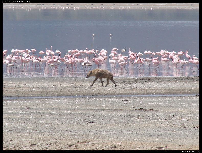 Vanmorgen om 6.00u de wekke, 6.30u ontbijt en stipt 7.00u reden we weg, op naar de krater! We zagen bovenop nog wat vrouwetjesolifanten, beneden leven alleen mannetjes omdat er niet genoeg eten is voor allemaal. De mannetjes komen alleen naar boven om te paren. Als eerste in de krater zagen we een kudde buffels, wat lijken dat toch een slome beesten. Vlak erna sloegen we rechtsaf toen Julio ons terug riep, een leeuwin met welpjes! Hoo, wij weer in de achteruit en eropaf. We zagen nog net hoe ze er eentje in haar bek nam en ze beide met zich meenam de greppel in, wow, dit was gaaf! Toen een hoop struisvogels, een aantal wildebeesten, een jakhals en wat thompson gazelles met wat warthogs. Genietend van het mooie uitzicht kwamen we nog een kori-bustard tegen. En toen dacht ik 2 leeuwinnen te zien, wij er op af, bleken het 2 jagende cheeta’s te zijn! Ze staken net de weg over toen wij aankwamen rijden en doken het hoge gras in, we zagen ze vanaf de achterkant een aanval opzetten. Bleek dat het om 2 jonge mannetjes ging die nog niet wisten dat een kudde gnoes helemaal geen mogelijkheid voor ze was, ze zijn veel te groot en waren te ver weg. Maar wat was dat gaaf om te zien, op een gegeven moment gingen ze samen op een heuveltje zitten en keken ze tegelijkertijd links, rechts en weer links, echt grappig! Daarna verdwenen ze en zagen wij een hoop wildebeesten en zebra’s drinken bij een rivier. In de verte een aantal hippo’s en flamingo’s in het meer. Even verderop lagen 5 leeuwinnen lekker te rusten en weer een endje verderop 3 leeuwinnen, waarvan er een aan het kluiven was op iets waarvan wij niet konden zien wat het was. Even verderop weer twee leeuwen waarbij de achterste in beweging kwam en met de voorste ging knuffelen, geweldig! Vrij snel daarna was de show alweer over en lieten ze zich weer op de zij vallen. Maar verderop zagen we alweer leeuwen en nu met een groot mannetje erbij, helaas had Mudi er niet echt de vaart in vandaag en was de leeuw alweer gaan liggen en konden we alleen zo zijn enorme manen bewonderen. Wat zouden we die toch graag eens rechtop zien, zo’n immens groot mannetje! Door dichtbegroeid bos speurend naar olifanten en neushoorns kwamen we aan bij de wc-stop. We stapten net onze jeep uit toen we zagen hoe de baboons bezit namen van een reeds geparkeerde jeep en alle tassen uitspitten op zoek naar eten. De buit was drie bananen en gillende vrouwen naast de jeep, haha. Wij heel hard lachen en snel ons dak dicht doen, zo ongelofelijk hoe snel die apen zijn! Na de korte pauze reden we weer verder en zagen we een hele kudde hippo’s rondom het water, omdat het hier niet warm is, zijn ze overdag op het land. Ervoor stonden een boel zebra’s wat het plaatje nog mooier maakte. Nog wat vogels, een groep pelikanen en in de verte een hartebeest gespot en ook zagen we weer 2 kori-bustards, nu hadden ze sprinkhanen gevangen. Verderop in een soort greppel dachten we eerst een leeuwin te zien liggen, bleek het een mega hyena te zijn, helemaal onder het bloed. Hmm die zal wel een grote kill hebben opgegeten denk ik en nu lag hij lekker voor pampus. In de verte zagen we nog een troep van zes leeuwinnen, maar ook deze lieten zich niet meer zien tegen de tijd dat wij er waren, ze lagen lekker in het hoge gras. Op weg terug naar de lodge zagen we de leeuwin met de 2 pups weer die ze nu goed verborgen hield. Terug bij de lodge konden we om 13.00u meteen aanschuiven voor de lunch, daar waren we wel aan toe na zo’n hele koude maar overweldigende ochtend vol met leeuwen en zelfs twee cheeta’s. Daarna doken we snel de zon in, wel uit de wind anders was het veel te koud en hebben we even gerelaxt. Daarna onder de douche weer opgewarmd en de spullen weer ingepakt. Ri zit lekker mee te zingen met haar I-Pod, nou het is echt geen gehoor, maar wel om te lachen, lekker bezig. Eten was gezellig maar niet echt lekker. We hebben in de bar wat gedronken met Keith en Cory, Ryan ging vroeg naar bed. Het was heel gezellig, weer veel gelachen. Onderweg naar de kamers weer geen melkweg te zien helaas, we werden gebracht door een man met een stok die de buffels voor ons op afstand moest houden… Hmmm dat klinkt wel gevaarlijk, het schijnt dat ze na 22.00u als het wat rustiger is bij de lodge hier komen grazen omdat ze het gras zo lekker vinden… Morgen op naar de laatste game drive, hopen dat we alles nog een keer zien! Het is 23.15u en we gaan snel slapen