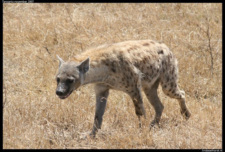 Vanmorgen om 6.00u de wekke, 6.30u ontbijt en stipt 7.00u reden we weg, op naar de krater! We zagen bovenop nog wat vrouwetjesolifanten, beneden leven alleen mannetjes omdat er niet genoeg eten is voor allemaal. De mannetjes komen alleen naar boven om te paren. Als eerste in de krater zagen we een kudde buffels, wat lijken dat toch een slome beesten. Vlak erna sloegen we rechtsaf toen Julio ons terug riep, een leeuwin met welpjes! Hoo, wij weer in de achteruit en eropaf. We zagen nog net hoe ze er eentje in haar bek nam en ze beide met zich meenam de greppel in, wow, dit was gaaf! Toen een hoop struisvogels, een aantal wildebeesten, een jakhals en wat thompson gazelles met wat warthogs. Genietend van het mooie uitzicht kwamen we nog een kori-bustard tegen. En toen dacht ik 2 leeuwinnen te zien, wij er op af, bleken het 2 jagende cheeta’s te zijn! Ze staken net de weg over toen wij aankwamen rijden en doken het hoge gras in, we zagen ze vanaf de achterkant een aanval opzetten. Bleek dat het om 2 jonge mannetjes ging die nog niet wisten dat een kudde gnoes helemaal geen mogelijkheid voor ze was, ze zijn veel te groot en waren te ver weg. Maar wat was dat gaaf om te zien, op een gegeven moment gingen ze samen op een heuveltje zitten en keken ze tegelijkertijd links, rechts en weer links, echt grappig! Daarna verdwenen ze en zagen wij een hoop wildebeesten en zebra’s drinken bij een rivier. In de verte een aantal hippo’s en flamingo’s in het meer. Even verderop lagen 5 leeuwinnen lekker te rusten en weer een endje verderop 3 leeuwinnen, waarvan er een aan het kluiven was op iets waarvan wij niet konden zien wat het was. Even verderop weer twee leeuwen waarbij de achterste in beweging kwam en met de voorste ging knuffelen, geweldig! Vrij snel daarna was de show alweer over en lieten ze zich weer op de zij vallen. Maar verderop zagen we alweer leeuwen en nu met een groot mannetje erbij, helaas had Mudi er niet echt de vaart in vandaag en was de leeuw alweer gaan liggen en konden we alleen zo zijn enorme manen bewonderen. Wat zouden we die toch graag eens rechtop zien, zo’n immens groot mannetje! Door dichtbegroeid bos speurend naar olifanten en neushoorns kwamen we aan bij de wc-stop. We stapten net onze jeep uit toen we zagen hoe de baboons bezit namen van een reeds geparkeerde jeep en alle tassen uitspitten op zoek naar eten. De buit was drie bananen en gillende vrouwen naast de jeep, haha. Wij heel hard lachen en snel ons dak dicht doen, zo ongelofelijk hoe snel die apen zijn! Na de korte pauze reden we weer verder en zagen we een hele kudde hippo’s rondom het water, omdat het hier niet warm is, zijn ze overdag op het land. Ervoor stonden een boel zebra’s wat het plaatje nog mooier maakte. Nog wat vogels, een groep pelikanen en in de verte een hartebeest gespot en ook zagen we weer 2 kori-bustards, nu hadden ze sprinkhanen gevangen. Verderop in een soort greppel dachten we eerst een leeuwin te zien liggen, bleek het een mega hyena te zijn, helemaal onder het bloed. Hmm die zal wel een grote kill hebben opgegeten denk ik en nu lag hij lekker voor pampus. In de verte zagen we nog een troep van zes leeuwinnen, maar ook deze lieten zich niet meer zien tegen de tijd dat wij er waren, ze lagen lekker in het hoge gras. Op weg terug naar de lodge zagen we de leeuwin met de 2 pups weer die ze nu goed verborgen hield. Terug bij de lodge konden we om 13.00u meteen aanschuiven voor de lunch, daar waren we wel aan toe na zo’n hele koude maar overweldigende ochtend vol met leeuwen en zelfs twee cheeta’s. Daarna doken we snel de zon in, wel uit de wind anders was het veel te koud en hebben we even gerelaxt. Daarna onder de douche weer opgewarmd en de spullen weer ingepakt. Ri zit lekker mee te zingen met haar I-Pod, nou het is echt geen gehoor, maar wel om te lachen, lekker bezig. Eten was gezellig maar niet echt lekker. We hebben in de bar wat gedronken met Keith en Cory, Ryan ging vroeg naar bed. Het was heel gezellig, weer veel gelachen. Onderweg naar de kamers weer geen melkweg te zien helaas, we werden gebracht door een man met een stok die de buffels voor ons op afstand moest houden… Hmmm dat klinkt wel gevaarlijk, het schijnt dat ze na 22.00u als het wat rustiger is bij de lodge hier komen grazen omdat ze het gras zo lekker vinden… Morgen op naar de laatste game drive, hopen dat we alles nog een keer zien! Het is 23.15u en we gaan snel slapen