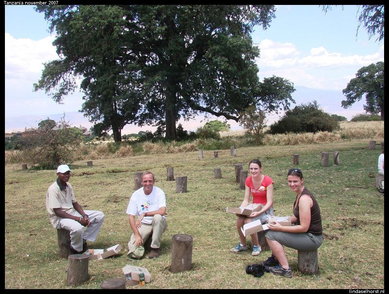 Vanmorgen wakker geworden van de wake up call om 7.00u. We hebben lekker geslapen onze eerste nacht. Heerlijke (koude) douche en om 7.30u ontbeten. Om 8.00u maakten we kennis met onze chauffeur / gids Mudi. We blijven de rest van de trip bij hem in de bus, wij vieren en Regina. Maar dat gaat allemaal helemaal passen in het 7 persoonsbusje die we tot onze beschikking hebben. Via een klein hobbelweggetje kwamen we via een lokale en drukke markt op de hoofdweg richting Arusha Ngurdoto Crater National Park. We genoten van het mooie landschap en de heerlijke geuren van Afrika. Helaas zagen we geen Mount Kilamanjaro door de bewolking, wel zagen we de Mount Meru. Direct na binnenkomst in het NP zagen we tientallen baboons, giraffen en zebra’s vlakbij de jeep. Onze eerste wild van deze reis! Na de nodige foto’s reden we via een ontzettend mooi en dichtbegroeid woud naar een uitkijkpunt over de krater. Heel erg mooi uitzicht met in de verte een heleboel baboons en een kudde buffels. Hmm, hier zou ik wel een dagje in de hangmat willen luieren, zoveel geluiden en zoveel te zien, wow! Hier zagen we ook de Eastern black en white Colabus (aap) welke alleen in dit park voorkomt binnen Tanzania. Ze zaten lekker in de bomen met hun grote witte pluimstaart heen en weer te zwiepen. Op weg door het park zagen we nog meer vergezichten, buffels, baboons, giraffen, warthogs en zebra’s. Onderweg ook nog in een klein museum gestopt waar we Ton met zijn hoofd in een hippo-bek hebben gelegd, haha dat was lachen! Na dit bezoek terug naar de lodge, lunchen, gewandeld door de tuin en kennisgemaakt met de rest van de groep, drie Amerikaanse jongens. Nu was onze groep compleet, 9 man over 2 jeeps verdeeld. Rond 14.00u vertrokken we richting Lake Manyara. Ondanks de mooie vergezichten viel ik halverwege de rit toch in slaap, echt ongelofelijk! Via de curioshop omhoog gereden naar ons hotel, op het topje van de berg. Prachtig uitzicht, hoewel het wederom niet helemaal helder weer was. Prachtige kamers met uitzicht op het meer en het park. Bij het zwembad hebben we genoten van het mooi uitzicht en de vele vogels rondom het water. Rond 18.00u begon het koud te worden en zijn we lekker warm gaan douchen. Om 22.30u liggen we in bed. Morgen gaan we op game drive en ’s middags 5 uur lang rijdend en vooral hobbelend naar de Serengeti!