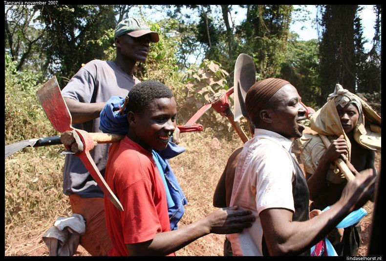 Lekker geslapen en ontbeten. Het is nog steeds erg koud en we stapten snel de jeeps in. De weg de krater uit was een stuk(je) beter dan de heenweg, gelukkig. Eenmaal uit het park werd het een asfaltweg en kregen we een mooi uitzicht over de nog steeds groene omgeving. Veel dorpjes en Masai lopend met hun koeien of geiten langs de weg. Rond het middaguur reden we Tarangire NP binnen en zagen we een mooi park met heel veel baobabbomen en een grote troep olifanten met kleintjes etend langs de weg. We zagen veel kapot gevreten bomen, zowel door olifanten als door termieten. We stopten bij een view-point waar we mooi uitzicht hadden over de vallei met een drooggevallen rivier. In de lunch kregen we een lunch en maakten we ons klaar om te zwemmen, maar helaas de zon verdween en het werd te koud. Toen hebben we de Amerikanen leren hartenjagen, was leuk. Om 16.00u vertrokken we voor onze laatste gamedrive. We zagen twee etende giraffen, gave beesten zijn dat toch. Toen een groepje olifanten wat net de weg overgestoken was, helemaal onder de rode stof. Even verderop weer een grote troep olifanten, ook weer met kleintjes erbij. Een moeder met een kleintje stond op de weg en schudde een paar keer met haar kop, gooide met zand en tetterde naar ons. Ook rende ze nog een paar stappen in onze richting, ohoh, wegwezen! Klein stukje achteruit gereden en weer staan kijken, ze bleef ons continu boos aankijken en liep de bosjes in. Daar tetterde ze nog een keer en hield ze ons in de gaten. Toen staken ze allemaal de weg over, wel 30 olifanten zagen we passeren. We reden een stukje verder en vlak achter de andere jeep was er weer een olifant boos geworden en schudde weer met de kop en nu tegen de achterste jeep, ze schrokken zich wezenloos, want de olifant was erg dichtbij en erg boos. Nu stonden wij voor ze en konden zij geen kant op, maar de chauffeurs hielden alles in de gaten. Wat een spektakel, echt geweldig! Toen alle olifanten de weg overgestoken waren, reden we weer een stukje verder en kwamen we weer een groep olifanten tegen. Ik maakte een foto waarbij ik de flits gebruikte en kreeg alweer getetter te horen en een boze blik, hmm ze zijn wel wat gepikeerd vandaag! Ook deze olifanten staken de weg over en hielden ons met boze blikken scherp in de gaten, brr wel heel gaaf maar ook een beetje eng was het wel. Later zagen we nog een paar dikdiks en een olifant in de verte. Langs de rivieroever zagen we nog twee leeuwinnen liggen, wat wel bijzonder was dat we die hier zagen; er zijn hier zoveel olifanten dat er bijna geen leeuwen zijn. Een schitterende sunset gezien, eindelijk! In de verte zagen we nog een groep olifanten en weer de leeuwinnen die lekker lagen te rollen in het zand. Terug in het hotel wat gedronken en elkaars foto’s bekeken, erg leuk om te zien hoe die jongens de ‘aanval’ van de olifant gezien hebben! Keith had een hele gave foto van de olifant op 3 meter afstand. Ook de foto’s uit Kenia heb ik nog gezien, daar hebben ze ook echt gave dingen beleefd, cheeta’s met een kill en een groepje neushoorns van heel dichtbij. De douche was lekker warm, het eten goed. In de bar hebben we gedronken, gekaart en gelachen. Het was een gezellige avond, tot in de late uurtjes…