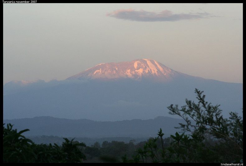 Lekker geslapen en ontbeten. Het is nog steeds erg koud en we stapten snel de jeeps in. De weg de krater uit was een stuk(je) beter dan de heenweg, gelukkig. Eenmaal uit het park werd het een asfaltweg en kregen we een mooi uitzicht over de nog steeds groene omgeving. Veel dorpjes en Masai lopend met hun koeien of geiten langs de weg. Rond het middaguur reden we Tarangire NP binnen en zagen we een mooi park met heel veel baobabbomen en een grote troep olifanten met kleintjes etend langs de weg. We zagen veel kapot gevreten bomen, zowel door olifanten als door termieten. We stopten bij een view-point waar we mooi uitzicht hadden over de vallei met een drooggevallen rivier. In de lunch kregen we een lunch en maakten we ons klaar om te zwemmen, maar helaas de zon verdween en het werd te koud. Toen hebben we de Amerikanen leren hartenjagen, was leuk. Om 16.00u vertrokken we voor onze laatste gamedrive. We zagen twee etende giraffen, gave beesten zijn dat toch. Toen een groepje olifanten wat net de weg overgestoken was, helemaal onder de rode stof. Even verderop weer een grote troep olifanten, ook weer met kleintjes erbij. Een moeder met een kleintje stond op de weg en schudde een paar keer met haar kop, gooide met zand en tetterde naar ons. Ook rende ze nog een paar stappen in onze richting, ohoh, wegwezen! Klein stukje achteruit gereden en weer staan kijken, ze bleef ons continu boos aankijken en liep de bosjes in. Daar tetterde ze nog een keer en hield ze ons in de gaten. Toen staken ze allemaal de weg over, wel 30 olifanten zagen we passeren. We reden een stukje verder en vlak achter de andere jeep was er weer een olifant boos geworden en schudde weer met de kop en nu tegen de achterste jeep, ze schrokken zich wezenloos, want de olifant was erg dichtbij en erg boos. Nu stonden wij voor ze en konden zij geen kant op, maar de chauffeurs hielden alles in de gaten. Wat een spektakel, echt geweldig! Toen alle olifanten de weg overgestoken waren, reden we weer een stukje verder en kwamen we weer een groep olifanten tegen. Ik maakte een foto waarbij ik de flits gebruikte en kreeg alweer getetter te horen en een boze blik, hmm ze zijn wel wat gepikeerd vandaag! Ook deze olifanten staken de weg over en hielden ons met boze blikken scherp in de gaten, brr wel heel gaaf maar ook een beetje eng was het wel. Later zagen we nog een paar dikdiks en een olifant in de verte. Langs de rivieroever zagen we nog twee leeuwinnen liggen, wat wel bijzonder was dat we die hier zagen; er zijn hier zoveel olifanten dat er bijna geen leeuwen zijn. Een schitterende sunset gezien, eindelijk! In de verte zagen we nog een groep olifanten en weer de leeuwinnen die lekker lagen te rollen in het zand. Terug in het hotel wat gedronken en elkaars foto’s bekeken, erg leuk om te zien hoe die jongens de ‘aanval’ van de olifant gezien hebben! Keith had een hele gave foto van de olifant op 3 meter afstand. Ook de foto’s uit Kenia heb ik nog gezien, daar hebben ze ook echt gave dingen beleefd, cheeta’s met een kill en een groepje neushoorns van heel dichtbij. De douche was lekker warm, het eten goed. In de bar hebben we gedronken, gekaart en gelachen. Het was een gezellige avond, tot in de late uurtjes…