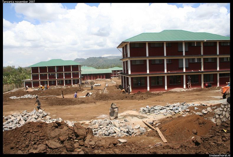 Vanmorgen om 8.00u zaten we weer in de jeep, op naar de laatste game drive in de Serengeti. De eerste tijd scheurden we overal langs totdat we een riviertje over moesten steken. Daar deden we drie keer over en aan de overkant van het meer zagen we links 4 leeuwinnen en rechts een heleboel wildebeesten. Helaas was er van beide kanten geen beweging en tuften wij verder. Nu zagen we nog meer wildebeesten bij elkaar en allemaal op weg naar de migratie, echt een overweldigend gezicht!! We hebben een tijdje tussen de duizenden wildebeesten rondgereden toen we weer om moesten keren naar het riviertje. Intussen waren de wildebeesten overgestoken en de leeuwinnen niet meer te zien. Wel zagen we een hoop gieren en een eenzame hyena die flink z’n best deed om alle gieren weg ta jagen, wat hem niet lukte in z’n eentje, het waren er teveel. Bij zo’n grote rots zagen we 2 jeeps staan, dat beloofde goed nieuws. En jawel, wat een geluk, 1 leeuw en 4 leeuwinnen waarvan er 1 zelfs zwanger was! Ze lagen (wederom) rustig te liggen, af en toe ging er een pootje of een kop omhoog maar dat was dan ook wel waar het bij bleef. Toen door naar de uitgang van het NP welke meteen over ging in het Ngorongoro NP. Bij de ingang konden we weer van een opperbest toilet genieten. Maar gelukkig ook hier een prachtig uitzicht over de vlaktes. Eenmaal terug bij de jeeps bleek er van de derde jeep de ventilator te zijn gesneuveld en moesten we die jeep achterlaten, de passagiers en de tassen werden over onze 2 jeeps. Na een tijdje door ‘skelettenland’ te hebben gereden, stopten we bij 1 duin ergens in de middle of nowhere. Weer pech, maar nu met de jeep van Julio, een lekke band. We zijn het duin opgeklommen, gezellig gekletst en een paar leuke foto’s gemaakt. Toen weer op weg en nog geen 20minuten later, weer de jeeps aan de kant, weer een lekke band! Dus weer uit de jeeps, kletsen in de zon, nieuwe band eronder, maar deze was ook al zacht, nou ja, op hoop van zegen. Zodra we hier uitstapten kwam er een Masai vrouw op ons af met 2 ezels, ze vroeg geld in ruil voor foto’s. Het land waar we ons nu bevinden is de ‘gorge’ waar de eerste mens gevonden (homo Sapiens) is en wordt alleen bewoond door de Masai, het is te dor en te droog om goed bewoond te kunnen worden. We reden na het verwisselen van de band door naar een uitkijkpunt over de vallei en hadden ook hier weer een schitterend uitzicht en een hoop lol met de amerikanen! De chauffeurs waren weer met de auto’s bezig en na een uurtje zat alles weer vast en konden we weer op pad. Nu gingen we door het lege landschap op weg naar een Masai-dorp. We werden verwelkomt met dans en zang en gingen in groepjes van 3 een hutje van binnen bekijken. Interessant hoor, we kregen uitleg over het leven van de Masai. Daarna nog een rondleiding door het dorpje en langs de plaatselijke school waar ze de ‘Jambo-song’ voor ons zongen. Toen ik begon te tellen in het engels, maakten zij het af, echt goed! Inmiddels had ik een klein ventje aan de hand wat me niet meer los liet, hoewel z’n moeder ons overal volgde. Nog steeds met het jochie aan de hand liepen we terug naar het dorp, terug naar de jeep en de volgende rit vol stof. Als de moeder het jochie niet had gepakt, was ie zo met ons mee gelopen. 20 minuten later kwamen we de chauffeur tegen die we eerder deze dag hadden achtergelaten met een kapotte ventilator. Hij stond nu weer stil met de nieuwe ventilator in zijn handen, dus wij weer stoppen, de chauffeurs haalden alle tools weer tevoorschijn en gingen weer al schreeuwend tegen elkaar aan de bak om de wagen te fiksen. Na 40minuten konden we weer op weg, want hij deed het weer. Hij wilde nog geen passagiers meenemen, die mochten in onze jeeps blijven. Nou, toen was de jeep van Julio weer aan de beurt, er was een slangetje los geschoten. We gaan lekker vandaag! Nieuw slangetje erin, weer wat geklus en gedoe en we konden weer op pad. Alleen onze jeep rijdt nog zonder problemen, als je het raam wat er steeds uitvalt niet mee rekent dan, haha. We vervolgden een stoffige weg en Mudi gaf vol gas omhoog en toen werd ik wel wat ziek, maar gelukkig was de afleiding van de prachtige uitzichten daar. In het hotel een koude handdoek, een drankje en de sleutel van een immens grote kamer met glazen serre met uitzicht op… een berg gras! Haha, geweldig! Lekker wat gedronken in de bar, koud gedoucht, alle apparatuur weer opgeladen en richting het diner. Goed buffet en toen weer naar de bar met de Amerikaanse jongens. We hebben veel gekletst en gelachen om ons belachelijke engels en een potje gekaart. Toen de bar dichtging hebben we op hun kamer ze leren meppen, haha! Toen nog een spelletje bullshit gespeeld waarbij ik wonderbaarlijk won zonder precies te weten hoe ik dat gedaan had, was het tijd om te slapen. Morgen naar de krater!
