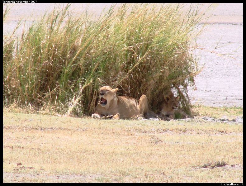 Vanmorgen om 6.00u de wekke, 6.30u ontbijt en stipt 7.00u reden we weg, op naar de krater! We zagen bovenop nog wat vrouwetjesolifanten, beneden leven alleen mannetjes omdat er niet genoeg eten is voor allemaal. De mannetjes komen alleen naar boven om te paren. Als eerste in de krater zagen we een kudde buffels, wat lijken dat toch een slome beesten. Vlak erna sloegen we rechtsaf toen Julio ons terug riep, een leeuwin met welpjes! Hoo, wij weer in de achteruit en eropaf. We zagen nog net hoe ze er eentje in haar bek nam en ze beide met zich meenam de greppel in, wow, dit was gaaf! Toen een hoop struisvogels, een aantal wildebeesten, een jakhals en wat thompson gazelles met wat warthogs. Genietend van het mooie uitzicht kwamen we nog een kori-bustard tegen. En toen dacht ik 2 leeuwinnen te zien, wij er op af, bleken het 2 jagende cheeta’s te zijn! Ze staken net de weg over toen wij aankwamen rijden en doken het hoge gras in, we zagen ze vanaf de achterkant een aanval opzetten. Bleek dat het om 2 jonge mannetjes ging die nog niet wisten dat een kudde gnoes helemaal geen mogelijkheid voor ze was, ze zijn veel te groot en waren te ver weg. Maar wat was dat gaaf om te zien, op een gegeven moment gingen ze samen op een heuveltje zitten en keken ze tegelijkertijd links, rechts en weer links, echt grappig! Daarna verdwenen ze en zagen wij een hoop wildebeesten en zebra’s drinken bij een rivier. In de verte een aantal hippo’s en flamingo’s in het meer. Even verderop lagen 5 leeuwinnen lekker te rusten en weer een endje verderop 3 leeuwinnen, waarvan er een aan het kluiven was op iets waarvan wij niet konden zien wat het was. Even verderop weer twee leeuwen waarbij de achterste in beweging kwam en met de voorste ging knuffelen, geweldig! Vrij snel daarna was de show alweer over en lieten ze zich weer op de zij vallen. Maar verderop zagen we alweer leeuwen en nu met een groot mannetje erbij, helaas had Mudi er niet echt de vaart in vandaag en was de leeuw alweer gaan liggen en konden we alleen zo zijn enorme manen bewonderen. Wat zouden we die toch graag eens rechtop zien, zo’n immens groot mannetje! Door dichtbegroeid bos speurend naar olifanten en neushoorns kwamen we aan bij de wc-stop. We stapten net onze jeep uit toen we zagen hoe de baboons bezit namen van een reeds geparkeerde jeep en alle tassen uitspitten op zoek naar eten. De buit was drie bananen en gillende vrouwen naast de jeep, haha. Wij heel hard lachen en snel ons dak dicht doen, zo ongelofelijk hoe snel die apen zijn! Na de korte pauze reden we weer verder en zagen we een hele kudde hippo’s rondom het water, omdat het hier niet warm is, zijn ze overdag op het land. Ervoor stonden een boel zebra’s wat het plaatje nog mooier maakte. Nog wat vogels, een groep pelikanen en in de verte een hartebeest gespot en ook zagen we weer 2 kori-bustards, nu hadden ze sprinkhanen gevangen. Verderop in een soort greppel dachten we eerst een leeuwin te zien liggen, bleek het een mega hyena te zijn, helemaal onder het bloed. Hmm die zal wel een grote kill hebben opgegeten denk ik en nu lag hij lekker voor pampus. In de verte zagen we nog een troep van zes leeuwinnen, maar ook deze lieten zich niet meer zien tegen de tijd dat wij er waren, ze lagen lekker in het hoge gras. Op weg terug naar de lodge zagen we de leeuwin met de 2 pups weer die ze nu goed verborgen hield. Terug bij de lodge konden we om 13.00u meteen aanschuiven voor de lunch, daar waren we wel aan toe na zo’n hele koude maar overweldigende ochtend vol met leeuwen en zelfs twee cheeta’s. Daarna doken we snel de zon in, wel uit de wind anders was het veel te koud en hebben we even gerelaxt. Daarna onder de douche weer opgewarmd en de spullen weer ingepakt. Ri zit lekker mee te zingen met haar I-Pod, nou het is echt geen gehoor, maar wel om te lachen, lekker bezig. Eten was gezellig maar niet echt lekker. We hebben in de bar wat gedronken met Keith en Cory, Ryan ging vroeg naar bed. Het was heel gezellig, weer veel gelachen. Onderweg naar de kamers weer geen melkweg te zien helaas, we werden gebracht door een man met een stok die de buffels voor ons op afstand moest houden… Hmmm dat klinkt wel gevaarlijk, het schijnt dat ze na 22.00u als het wat rustiger is bij de lodge hier komen grazen omdat ze het gras zo lekker vinden… Morgen op naar de laatste game drive, hopen dat we alles nog een keer zien! Het is 23.15u en we gaan snel slapen