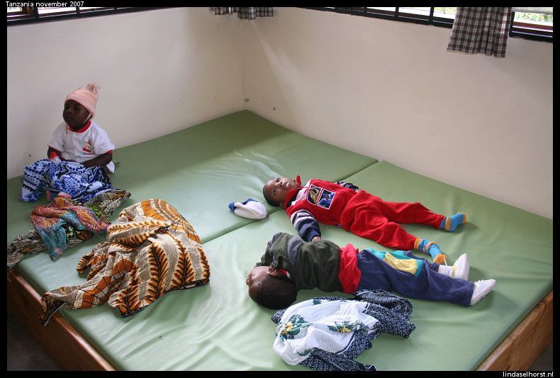 Vanmorgen om 8.00u zaten we weer in de jeep, op naar de laatste game drive in de Serengeti. De eerste tijd scheurden we overal langs totdat we een riviertje over moesten steken. Daar deden we drie keer over en aan de overkant van het meer zagen we links 4 leeuwinnen en rechts een heleboel wildebeesten. Helaas was er van beide kanten geen beweging en tuften wij verder. Nu zagen we nog meer wildebeesten bij elkaar en allemaal op weg naar de migratie, echt een overweldigend gezicht!! We hebben een tijdje tussen de duizenden wildebeesten rondgereden toen we weer om moesten keren naar het riviertje. Intussen waren de wildebeesten overgestoken en de leeuwinnen niet meer te zien. Wel zagen we een hoop gieren en een eenzame hyena die flink z’n best deed om alle gieren weg ta jagen, wat hem niet lukte in z’n eentje, het waren er teveel. Bij zo’n grote rots zagen we 2 jeeps staan, dat beloofde goed nieuws. En jawel, wat een geluk, 1 leeuw en 4 leeuwinnen waarvan er 1 zelfs zwanger was! Ze lagen (wederom) rustig te liggen, af en toe ging er een pootje of een kop omhoog maar dat was dan ook wel waar het bij bleef. Toen door naar de uitgang van het NP welke meteen over ging in het Ngorongoro NP. Bij de ingang konden we weer van een opperbest toilet genieten. Maar gelukkig ook hier een prachtig uitzicht over de vlaktes. Eenmaal terug bij de jeeps bleek er van de derde jeep de ventilator te zijn gesneuveld en moesten we die jeep achterlaten, de passagiers en de tassen werden over onze 2 jeeps. Na een tijdje door ‘skelettenland’ te hebben gereden, stopten we bij 1 duin ergens in de middle of nowhere. Weer pech, maar nu met de jeep van Julio, een lekke band. We zijn het duin opgeklommen, gezellig gekletst en een paar leuke foto’s gemaakt. Toen weer op weg en nog geen 20minuten later, weer de jeeps aan de kant, weer een lekke band! Dus weer uit de jeeps, kletsen in de zon, nieuwe band eronder, maar deze was ook al zacht, nou ja, op hoop van zegen. Zodra we hier uitstapten kwam er een Masai vrouw op ons af met 2 ezels, ze vroeg geld in ruil voor foto’s. Het land waar we ons nu bevinden is de ‘gorge’ waar de eerste mens gevonden (homo Sapiens) is en wordt alleen bewoond door de Masai, het is te dor en te droog om goed bewoond te kunnen worden. We reden na het verwisselen van de band door naar een uitkijkpunt over de vallei en hadden ook hier weer een schitterend uitzicht en een hoop lol met de amerikanen! De chauffeurs waren weer met de auto’s bezig en na een uurtje zat alles weer vast en konden we weer op pad. Nu gingen we door het lege landschap op weg naar een Masai-dorp. We werden verwelkomt met dans en zang en gingen in groepjes van 3 een hutje van binnen bekijken. Interessant hoor, we kregen uitleg over het leven van de Masai. Daarna nog een rondleiding door het dorpje en langs de plaatselijke school waar ze de ‘Jambo-song’ voor ons zongen. Toen ik begon te tellen in het engels, maakten zij het af, echt goed! Inmiddels had ik een klein ventje aan de hand wat me niet meer los liet, hoewel z’n moeder ons overal volgde. Nog steeds met het jochie aan de hand liepen we terug naar het dorp, terug naar de jeep en de volgende rit vol stof. Als de moeder het jochie niet had gepakt, was ie zo met ons mee gelopen. 20 minuten later kwamen we de chauffeur tegen die we eerder deze dag hadden achtergelaten met een kapotte ventilator. Hij stond nu weer stil met de nieuwe ventilator in zijn handen, dus wij weer stoppen, de chauffeurs haalden alle tools weer tevoorschijn en gingen weer al schreeuwend tegen elkaar aan de bak om de wagen te fiksen. Na 40minuten konden we weer op weg, want hij deed het weer. Hij wilde nog geen passagiers meenemen, die mochten in onze jeeps blijven. Nou, toen was de jeep van Julio weer aan de beurt, er was een slangetje los geschoten. We gaan lekker vandaag! Nieuw slangetje erin, weer wat geklus en gedoe en we konden weer op pad. Alleen onze jeep rijdt nog zonder problemen, als je het raam wat er steeds uitvalt niet mee rekent dan, haha. We vervolgden een stoffige weg en Mudi gaf vol gas omhoog en toen werd ik wel wat ziek, maar gelukkig was de afleiding van de prachtige uitzichten daar. In het hotel een koude handdoek, een drankje en de sleutel van een immens grote kamer met glazen serre met uitzicht op… een berg gras! Haha, geweldig! Lekker wat gedronken in de bar, koud gedoucht, alle apparatuur weer opgeladen en richting het diner. Goed buffet en toen weer naar de bar met de Amerikaanse jongens. We hebben veel gekletst en gelachen om ons belachelijke engels en een potje gekaart. Toen de bar dichtging hebben we op hun kamer ze leren meppen, haha! Toen nog een spelletje bullshit gespeeld waarbij ik wonderbaarlijk won zonder precies te weten hoe ik dat gedaan had, was het tijd om te slapen. Morgen naar de krater!