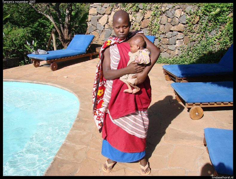 Vanmorgen om 8.00u zaten we weer in de jeep, op naar de laatste game drive in de Serengeti. De eerste tijd scheurden we overal langs totdat we een riviertje over moesten steken. Daar deden we drie keer over en aan de overkant van het meer zagen we links 4 leeuwinnen en rechts een heleboel wildebeesten. Helaas was er van beide kanten geen beweging en tuften wij verder. Nu zagen we nog meer wildebeesten bij elkaar en allemaal op weg naar de migratie, echt een overweldigend gezicht!! We hebben een tijdje tussen de duizenden wildebeesten rondgereden toen we weer om moesten keren naar het riviertje. Intussen waren de wildebeesten overgestoken en de leeuwinnen niet meer te zien. Wel zagen we een hoop gieren en een eenzame hyena die flink z’n best deed om alle gieren weg ta jagen, wat hem niet lukte in z’n eentje, het waren er teveel. Bij zo’n grote rots zagen we 2 jeeps staan, dat beloofde goed nieuws. En jawel, wat een geluk, 1 leeuw en 4 leeuwinnen waarvan er 1 zelfs zwanger was! Ze lagen (wederom) rustig te liggen, af en toe ging er een pootje of een kop omhoog maar dat was dan ook wel waar het bij bleef. Toen door naar de uitgang van het NP welke meteen over ging in het Ngorongoro NP. Bij de ingang konden we weer van een opperbest toilet genieten. Maar gelukkig ook hier een prachtig uitzicht over de vlaktes. Eenmaal terug bij de jeeps bleek er van de derde jeep de ventilator te zijn gesneuveld en moesten we die jeep achterlaten, de passagiers en de tassen werden over onze 2 jeeps. Na een tijdje door ‘skelettenland’ te hebben gereden, stopten we bij 1 duin ergens in de middle of nowhere. Weer pech, maar nu met de jeep van Julio, een lekke band. We zijn het duin opgeklommen, gezellig gekletst en een paar leuke foto’s gemaakt. Toen weer op weg en nog geen 20minuten later, weer de jeeps aan de kant, weer een lekke band! Dus weer uit de jeeps, kletsen in de zon, nieuwe band eronder, maar deze was ook al zacht, nou ja, op hoop van zegen. Zodra we hier uitstapten kwam er een Masai vrouw op ons af met 2 ezels, ze vroeg geld in ruil voor foto’s. Het land waar we ons nu bevinden is de ‘gorge’ waar de eerste mens gevonden (homo Sapiens) is en wordt alleen bewoond door de Masai, het is te dor en te droog om goed bewoond te kunnen worden. We reden na het verwisselen van de band door naar een uitkijkpunt over de vallei en hadden ook hier weer een schitterend uitzicht en een hoop lol met de amerikanen! De chauffeurs waren weer met de auto’s bezig en na een uurtje zat alles weer vast en konden we weer op pad. Nu gingen we door het lege landschap op weg naar een Masai-dorp. We werden verwelkomt met dans en zang en gingen in groepjes van 3 een hutje van binnen bekijken. Interessant hoor, we kregen uitleg over het leven van de Masai. Daarna nog een rondleiding door het dorpje en langs de plaatselijke school waar ze de ‘Jambo-song’ voor ons zongen. Toen ik begon te tellen in het engels, maakten zij het af, echt goed! Inmiddels had ik een klein ventje aan de hand wat me niet meer los liet, hoewel z’n moeder ons overal volgde. Nog steeds met het jochie aan de hand liepen we terug naar het dorp, terug naar de jeep en de volgende rit vol stof. Als de moeder het jochie niet had gepakt, was ie zo met ons mee gelopen. 20 minuten later kwamen we de chauffeur tegen die we eerder deze dag hadden achtergelaten met een kapotte ventilator. Hij stond nu weer stil met de nieuwe ventilator in zijn handen, dus wij weer stoppen, de chauffeurs haalden alle tools weer tevoorschijn en gingen weer al schreeuwend tegen elkaar aan de bak om de wagen te fiksen. Na 40minuten konden we weer op weg, want hij deed het weer. Hij wilde nog geen passagiers meenemen, die mochten in onze jeeps blijven. Nou, toen was de jeep van Julio weer aan de beurt, er was een slangetje los geschoten. We gaan lekker vandaag! Nieuw slangetje erin, weer wat geklus en gedoe en we konden weer op pad. Alleen onze jeep rijdt nog zonder problemen, als je het raam wat er steeds uitvalt niet mee rekent dan, haha. We vervolgden een stoffige weg en Mudi gaf vol gas omhoog en toen werd ik wel wat ziek, maar gelukkig was de afleiding van de prachtige uitzichten daar. In het hotel een koude handdoek, een drankje en de sleutel van een immens grote kamer met glazen serre met uitzicht op… een berg gras! Haha, geweldig! Lekker wat gedronken in de bar, koud gedoucht, alle apparatuur weer opgeladen en richting het diner. Goed buffet en toen weer naar de bar met de Amerikaanse jongens. We hebben veel gekletst en gelachen om ons belachelijke engels en een potje gekaart. Toen de bar dichtging hebben we op hun kamer ze leren meppen, haha! Toen nog een spelletje bullshit gespeeld waarbij ik wonderbaarlijk won zonder precies te weten hoe ik dat gedaan had, was het tijd om te slapen. Morgen naar de krater!