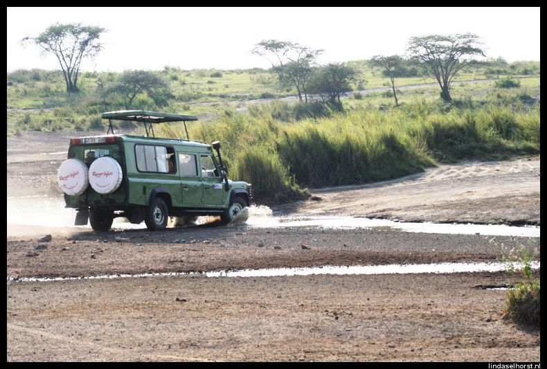 Vanmorgen om 8.00u zaten we weer in de jeep, op naar de laatste game drive in de Serengeti. De eerste tijd scheurden we overal langs totdat we een riviertje over moesten steken. Daar deden we drie keer over en aan de overkant van het meer zagen we links 4 leeuwinnen en rechts een heleboel wildebeesten. Helaas was er van beide kanten geen beweging en tuften wij verder. Nu zagen we nog meer wildebeesten bij elkaar en allemaal op weg naar de migratie, echt een overweldigend gezicht!! We hebben een tijdje tussen de duizenden wildebeesten rondgereden toen we weer om moesten keren naar het riviertje. Intussen waren de wildebeesten overgestoken en de leeuwinnen niet meer te zien. Wel zagen we een hoop gieren en een eenzame hyena die flink z’n best deed om alle gieren weg ta jagen, wat hem niet lukte in z’n eentje, het waren er teveel. Bij zo’n grote rots zagen we 2 jeeps staan, dat beloofde goed nieuws. En jawel, wat een geluk, 1 leeuw en 4 leeuwinnen waarvan er 1 zelfs zwanger was! Ze lagen (wederom) rustig te liggen, af en toe ging er een pootje of een kop omhoog maar dat was dan ook wel waar het bij bleef. Toen door naar de uitgang van het NP welke meteen over ging in het Ngorongoro NP. Bij de ingang konden we weer van een opperbest toilet genieten. Maar gelukkig ook hier een prachtig uitzicht over de vlaktes. Eenmaal terug bij de jeeps bleek er van de derde jeep de ventilator te zijn gesneuveld en moesten we die jeep achterlaten, de passagiers en de tassen werden over onze 2 jeeps. Na een tijdje door ‘skelettenland’ te hebben gereden, stopten we bij 1 duin ergens in de middle of nowhere. Weer pech, maar nu met de jeep van Julio, een lekke band. We zijn het duin opgeklommen, gezellig gekletst en een paar leuke foto’s gemaakt. Toen weer op weg en nog geen 20minuten later, weer de jeeps aan de kant, weer een lekke band! Dus weer uit de jeeps, kletsen in de zon, nieuwe band eronder, maar deze was ook al zacht, nou ja, op hoop van zegen. Zodra we hier uitstapten kwam er een Masai vrouw op ons af met 2 ezels, ze vroeg geld in ruil voor foto’s. Het land waar we ons nu bevinden is de ‘gorge’ waar de eerste mens gevonden (homo Sapiens) is en wordt alleen bewoond door de Masai, het is te dor en te droog om goed bewoond te kunnen worden. We reden na het verwisselen van de band door naar een uitkijkpunt over de vallei en hadden ook hier weer een schitterend uitzicht en een hoop lol met de amerikanen! De chauffeurs waren weer met de auto’s bezig en na een uurtje zat alles weer vast en konden we weer op pad. Nu gingen we door het lege landschap op weg naar een Masai-dorp. We werden verwelkomt met dans en zang en gingen in groepjes van 3 een hutje van binnen bekijken. Interessant hoor, we kregen uitleg over het leven van de Masai. Daarna nog een rondleiding door het dorpje en langs de plaatselijke school waar ze de ‘Jambo-song’ voor ons zongen. Toen ik begon te tellen in het engels, maakten zij het af, echt goed! Inmiddels had ik een klein ventje aan de hand wat me niet meer los liet, hoewel z’n moeder ons overal volgde. Nog steeds met het jochie aan de hand liepen we terug naar het dorp, terug naar de jeep en de volgende rit vol stof. Als de moeder het jochie niet had gepakt, was ie zo met ons mee gelopen. 20 minuten later kwamen we de chauffeur tegen die we eerder deze dag hadden achtergelaten met een kapotte ventilator. Hij stond nu weer stil met de nieuwe ventilator in zijn handen, dus wij weer stoppen, de chauffeurs haalden alle tools weer tevoorschijn en gingen weer al schreeuwend tegen elkaar aan de bak om de wagen te fiksen. Na 40minuten konden we weer op weg, want hij deed het weer. Hij wilde nog geen passagiers meenemen, die mochten in onze jeeps blijven. Nou, toen was de jeep van Julio weer aan de beurt, er was een slangetje los geschoten. We gaan lekker vandaag! Nieuw slangetje erin, weer wat geklus en gedoe en we konden weer op pad. Alleen onze jeep rijdt nog zonder problemen, als je het raam wat er steeds uitvalt niet mee rekent dan, haha. We vervolgden een stoffige weg en Mudi gaf vol gas omhoog en toen werd ik wel wat ziek, maar gelukkig was de afleiding van de prachtige uitzichten daar. In het hotel een koude handdoek, een drankje en de sleutel van een immens grote kamer met glazen serre met uitzicht op… een berg gras! Haha, geweldig! Lekker wat gedronken in de bar, koud gedoucht, alle apparatuur weer opgeladen en richting het diner. Goed buffet en toen weer naar de bar met de Amerikaanse jongens. We hebben veel gekletst en gelachen om ons belachelijke engels en een potje gekaart. Toen de bar dichtging hebben we op hun kamer ze leren meppen, haha! Toen nog een spelletje bullshit gespeeld waarbij ik wonderbaarlijk won zonder precies te weten hoe ik dat gedaan had, was het tijd om te slapen. Morgen naar de krater!