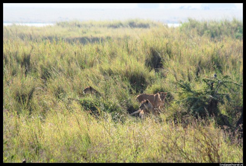 Vanmorgen om 6.00u de wekke, 6.30u ontbijt en stipt 7.00u reden we weg, op naar de krater! We zagen bovenop nog wat vrouwetjesolifanten, beneden leven alleen mannetjes omdat er niet genoeg eten is voor allemaal. De mannetjes komen alleen naar boven om te paren. Als eerste in de krater zagen we een kudde buffels, wat lijken dat toch een slome beesten. Vlak erna sloegen we rechtsaf toen Julio ons terug riep, een leeuwin met welpjes! Hoo, wij weer in de achteruit en eropaf. We zagen nog net hoe ze er eentje in haar bek nam en ze beide met zich meenam de greppel in, wow, dit was gaaf! Toen een hoop struisvogels, een aantal wildebeesten, een jakhals en wat thompson gazelles met wat warthogs. Genietend van het mooie uitzicht kwamen we nog een kori-bustard tegen. En toen dacht ik 2 leeuwinnen te zien, wij er op af, bleken het 2 jagende cheeta’s te zijn! Ze staken net de weg over toen wij aankwamen rijden en doken het hoge gras in, we zagen ze vanaf de achterkant een aanval opzetten. Bleek dat het om 2 jonge mannetjes ging die nog niet wisten dat een kudde gnoes helemaal geen mogelijkheid voor ze was, ze zijn veel te groot en waren te ver weg. Maar wat was dat gaaf om te zien, op een gegeven moment gingen ze samen op een heuveltje zitten en keken ze tegelijkertijd links, rechts en weer links, echt grappig! Daarna verdwenen ze en zagen wij een hoop wildebeesten en zebra’s drinken bij een rivier. In de verte een aantal hippo’s en flamingo’s in het meer. Even verderop lagen 5 leeuwinnen lekker te rusten en weer een endje verderop 3 leeuwinnen, waarvan er een aan het kluiven was op iets waarvan wij niet konden zien wat het was. Even verderop weer twee leeuwen waarbij de achterste in beweging kwam en met de voorste ging knuffelen, geweldig! Vrij snel daarna was de show alweer over en lieten ze zich weer op de zij vallen. Maar verderop zagen we alweer leeuwen en nu met een groot mannetje erbij, helaas had Mudi er niet echt de vaart in vandaag en was de leeuw alweer gaan liggen en konden we alleen zo zijn enorme manen bewonderen. Wat zouden we die toch graag eens rechtop zien, zo’n immens groot mannetje! Door dichtbegroeid bos speurend naar olifanten en neushoorns kwamen we aan bij de wc-stop. We stapten net onze jeep uit toen we zagen hoe de baboons bezit namen van een reeds geparkeerde jeep en alle tassen uitspitten op zoek naar eten. De buit was drie bananen en gillende vrouwen naast de jeep, haha. Wij heel hard lachen en snel ons dak dicht doen, zo ongelofelijk hoe snel die apen zijn! Na de korte pauze reden we weer verder en zagen we een hele kudde hippo’s rondom het water, omdat het hier niet warm is, zijn ze overdag op het land. Ervoor stonden een boel zebra’s wat het plaatje nog mooier maakte. Nog wat vogels, een groep pelikanen en in de verte een hartebeest gespot en ook zagen we weer 2 kori-bustards, nu hadden ze sprinkhanen gevangen. Verderop in een soort greppel dachten we eerst een leeuwin te zien liggen, bleek het een mega hyena te zijn, helemaal onder het bloed. Hmm die zal wel een grote kill hebben opgegeten denk ik en nu lag hij lekker voor pampus. In de verte zagen we nog een troep van zes leeuwinnen, maar ook deze lieten zich niet meer zien tegen de tijd dat wij er waren, ze lagen lekker in het hoge gras. Op weg terug naar de lodge zagen we de leeuwin met de 2 pups weer die ze nu goed verborgen hield. Terug bij de lodge konden we om 13.00u meteen aanschuiven voor de lunch, daar waren we wel aan toe na zo’n hele koude maar overweldigende ochtend vol met leeuwen en zelfs twee cheeta’s. Daarna doken we snel de zon in, wel uit de wind anders was het veel te koud en hebben we even gerelaxt. Daarna onder de douche weer opgewarmd en de spullen weer ingepakt. Ri zit lekker mee te zingen met haar I-Pod, nou het is echt geen gehoor, maar wel om te lachen, lekker bezig. Eten was gezellig maar niet echt lekker. We hebben in de bar wat gedronken met Keith en Cory, Ryan ging vroeg naar bed. Het was heel gezellig, weer veel gelachen. Onderweg naar de kamers weer geen melkweg te zien helaas, we werden gebracht door een man met een stok die de buffels voor ons op afstand moest houden… Hmmm dat klinkt wel gevaarlijk, het schijnt dat ze na 22.00u als het wat rustiger is bij de lodge hier komen grazen omdat ze het gras zo lekker vinden… Morgen op naar de laatste game drive, hopen dat we alles nog een keer zien! Het is 23.15u en we gaan snel slapen