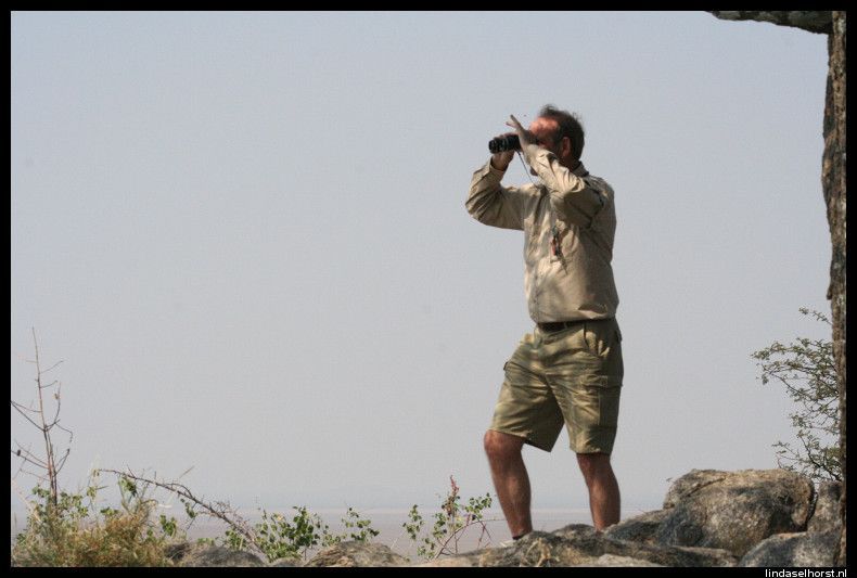 Op tijd ontbeten en stipt om 8.00u reden we richting Lake Manyara. Bij de ingang van het park werden we opgewacht door tientallen baboons. Eenmaal in het park werden we omringd door wel 1000 kleuren groen en vele vele baboons! Wat een ontzettend mooi en vooral groen park, het lijkt het tropische regenwoud van Ecuador wel. We zagen 2 mannetjes olifanten van een behoorlijke afstand en wederom baboons, vele soorten vogels, warthogs en impala’s. Na zo’n 2,5uur in het park gereden te hebben, reden we richting een picnic-place voor een sanitaire stop, maar vlak ervoor zagen we het schuwe luipaard hoog in een boom zitten. Wow, wat gaaf! Hij ging nog een paar keer verzitten en leek zich niet echt aan ons te storen, nu stonden we ook echt wel een eindje weg maar toch. Bij de stop een korte plaspauze en weer door. We kwamen weer langs het luipaard en hij lag nog steeds relaxt om zich heen te kijken. We kwamen langs de hippo-pool waar we een hoop ogen en oren boven het water zagen uitsteken en dat tussen allerlei soorten vogels. Om 12.00u waren we weer terug voor de lunch en om 13.00u vertrokken we naar de Serengeti. Onderweg zijn we alle kanten opgestuiterd door het slechte wegdek, echt ongelofelijk. Maar we hebben mooie dingen gezien; impala’s, warthogs, struisvogels, zebra’s en toen we binnen de grenzen van het park waren, zagen we nog een aantal gieren genieten van een kill. Dat was een geinig gezicht, allemaal stonden ze te wachten tot de grote baas uitgegeten was en toen de baas met veel vertoon wegliep, stormde de groep en op af en vocht om de laatste stukjes vlies, huid en haar, geweldig!  Inmiddels waren wij al verder gereden tot we werden teruggeroepen door de andere jeep van Julio. Ze hadden een leeuw gespot. Wij als een gek weer terug en het enige wat we zagen waren een heleboel manen, meer liet hij niet zien, jammer! Het gras was te hoog en hij lag te ver weg voor een mooie blik op z’n kop en lijf. Maar even later zagen we twee leeuwinnen lekker luieren in de zon, bovenop een groot rotsblok. Verder nog vele impala’s en wildebeesten gezien en nog een paar warthogs. En nog een gevlekte hyena en een black backed jackal, maar we konden niet te lang blijven staan, want we moesten voor het donker binnen zijn. Toen kwamen we een grote groep olifanten tegen, wow! En zo dichtbij! Opeens zeker te dichtbij want er begon er een te tetteren en met zijn kop te schudden, wegwezen! Toen ze voorbij waren gingen we volgas naar de lodge, waar we prachtig uitkeken over de eindeloze vlaktes. Het buffet smaakte weer goed, helaas eten we nergens plaatslijk wild. De vergunning daarvoor schijnt erg duur te zijn, helaas. Na het eten werden Ri en ik uitgenodigd door Keith, Cory en Ryan om gezellig wat te drinken in de bar, we hebben leuk gekletst. Zij komen uit St Louis en verhuizen komende maand alledrie naar New York, kijk, daar hebben we wat aan ;-). Om 23.30u liggen we in bed en maken ons klaar voor een full day game drive van morgen in de Serengeti.