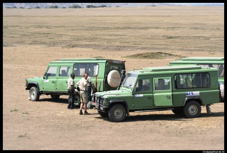 Vanmorgen om 8.00u zaten we weer in de jeep, op naar de laatste game drive in de Serengeti. De eerste tijd scheurden we overal langs totdat we een riviertje over moesten steken. Daar deden we drie keer over en aan de overkant van het meer zagen we links 4 leeuwinnen en rechts een heleboel wildebeesten. Helaas was er van beide kanten geen beweging en tuften wij verder. Nu zagen we nog meer wildebeesten bij elkaar en allemaal op weg naar de migratie, echt een overweldigend gezicht!! We hebben een tijdje tussen de duizenden wildebeesten rondgereden toen we weer om moesten keren naar het riviertje. Intussen waren de wildebeesten overgestoken en de leeuwinnen niet meer te zien. Wel zagen we een hoop gieren en een eenzame hyena die flink z’n best deed om alle gieren weg ta jagen, wat hem niet lukte in z’n eentje, het waren er teveel. Bij zo’n grote rots zagen we 2 jeeps staan, dat beloofde goed nieuws. En jawel, wat een geluk, 1 leeuw en 4 leeuwinnen waarvan er 1 zelfs zwanger was! Ze lagen (wederom) rustig te liggen, af en toe ging er een pootje of een kop omhoog maar dat was dan ook wel waar het bij bleef. Toen door naar de uitgang van het NP welke meteen over ging in het Ngorongoro NP. Bij de ingang konden we weer van een opperbest toilet genieten. Maar gelukkig ook hier een prachtig uitzicht over de vlaktes. Eenmaal terug bij de jeeps bleek er van de derde jeep de ventilator te zijn gesneuveld en moesten we die jeep achterlaten, de passagiers en de tassen werden over onze 2 jeeps. Na een tijdje door ‘skelettenland’ te hebben gereden, stopten we bij 1 duin ergens in de middle of nowhere. Weer pech, maar nu met de jeep van Julio, een lekke band. We zijn het duin opgeklommen, gezellig gekletst en een paar leuke foto’s gemaakt. Toen weer op weg en nog geen 20minuten later, weer de jeeps aan de kant, weer een lekke band! Dus weer uit de jeeps, kletsen in de zon, nieuwe band eronder, maar deze was ook al zacht, nou ja, op hoop van zegen. Zodra we hier uitstapten kwam er een Masai vrouw op ons af met 2 ezels, ze vroeg geld in ruil voor foto’s. Het land waar we ons nu bevinden is de ‘gorge’ waar de eerste mens gevonden (homo Sapiens) is en wordt alleen bewoond door de Masai, het is te dor en te droog om goed bewoond te kunnen worden. We reden na het verwisselen van de band door naar een uitkijkpunt over de vallei en hadden ook hier weer een schitterend uitzicht en een hoop lol met de amerikanen! De chauffeurs waren weer met de auto’s bezig en na een uurtje zat alles weer vast en konden we weer op pad. Nu gingen we door het lege landschap op weg naar een Masai-dorp. We werden verwelkomt met dans en zang en gingen in groepjes van 3 een hutje van binnen bekijken. Interessant hoor, we kregen uitleg over het leven van de Masai. Daarna nog een rondleiding door het dorpje en langs de plaatselijke school waar ze de ‘Jambo-song’ voor ons zongen. Toen ik begon te tellen in het engels, maakten zij het af, echt goed! Inmiddels had ik een klein ventje aan de hand wat me niet meer los liet, hoewel z’n moeder ons overal volgde. Nog steeds met het jochie aan de hand liepen we terug naar het dorp, terug naar de jeep en de volgende rit vol stof. Als de moeder het jochie niet had gepakt, was ie zo met ons mee gelopen. 20 minuten later kwamen we de chauffeur tegen die we eerder deze dag hadden achtergelaten met een kapotte ventilator. Hij stond nu weer stil met de nieuwe ventilator in zijn handen, dus wij weer stoppen, de chauffeurs haalden alle tools weer tevoorschijn en gingen weer al schreeuwend tegen elkaar aan de bak om de wagen te fiksen. Na 40minuten konden we weer op weg, want hij deed het weer. Hij wilde nog geen passagiers meenemen, die mochten in onze jeeps blijven. Nou, toen was de jeep van Julio weer aan de beurt, er was een slangetje los geschoten. We gaan lekker vandaag! Nieuw slangetje erin, weer wat geklus en gedoe en we konden weer op pad. Alleen onze jeep rijdt nog zonder problemen, als je het raam wat er steeds uitvalt niet mee rekent dan, haha. We vervolgden een stoffige weg en Mudi gaf vol gas omhoog en toen werd ik wel wat ziek, maar gelukkig was de afleiding van de prachtige uitzichten daar. In het hotel een koude handdoek, een drankje en de sleutel van een immens grote kamer met glazen serre met uitzicht op… een berg gras! Haha, geweldig! Lekker wat gedronken in de bar, koud gedoucht, alle apparatuur weer opgeladen en richting het diner. Goed buffet en toen weer naar de bar met de Amerikaanse jongens. We hebben veel gekletst en gelachen om ons belachelijke engels en een potje gekaart. Toen de bar dichtging hebben we op hun kamer ze leren meppen, haha! Toen nog een spelletje bullshit gespeeld waarbij ik wonderbaarlijk won zonder precies te weten hoe ik dat gedaan had, was het tijd om te slapen. Morgen naar de krater!