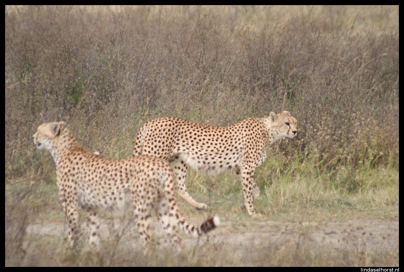 Vanmorgen om 6.00u de wekke, 6.30u ontbijt en stipt 7.00u reden we weg, op naar de krater! We zagen bovenop nog wat vrouwetjesolifanten, beneden leven alleen mannetjes omdat er niet genoeg eten is voor allemaal. De mannetjes komen alleen naar boven om te paren. Als eerste in de krater zagen we een kudde buffels, wat lijken dat toch een slome beesten. Vlak erna sloegen we rechtsaf toen Julio ons terug riep, een leeuwin met welpjes! Hoo, wij weer in de achteruit en eropaf. We zagen nog net hoe ze er eentje in haar bek nam en ze beide met zich meenam de greppel in, wow, dit was gaaf! Toen een hoop struisvogels, een aantal wildebeesten, een jakhals en wat thompson gazelles met wat warthogs. Genietend van het mooie uitzicht kwamen we nog een kori-bustard tegen. En toen dacht ik 2 leeuwinnen te zien, wij er op af, bleken het 2 jagende cheeta’s te zijn! Ze staken net de weg over toen wij aankwamen rijden en doken het hoge gras in, we zagen ze vanaf de achterkant een aanval opzetten. Bleek dat het om 2 jonge mannetjes ging die nog niet wisten dat een kudde gnoes helemaal geen mogelijkheid voor ze was, ze zijn veel te groot en waren te ver weg. Maar wat was dat gaaf om te zien, op een gegeven moment gingen ze samen op een heuveltje zitten en keken ze tegelijkertijd links, rechts en weer links, echt grappig! Daarna verdwenen ze en zagen wij een hoop wildebeesten en zebra’s drinken bij een rivier. In de verte een aantal hippo’s en flamingo’s in het meer. Even verderop lagen 5 leeuwinnen lekker te rusten en weer een endje verderop 3 leeuwinnen, waarvan er een aan het kluiven was op iets waarvan wij niet konden zien wat het was. Even verderop weer twee leeuwen waarbij de achterste in beweging kwam en met de voorste ging knuffelen, geweldig! Vrij snel daarna was de show alweer over en lieten ze zich weer op de zij vallen. Maar verderop zagen we alweer leeuwen en nu met een groot mannetje erbij, helaas had Mudi er niet echt de vaart in vandaag en was de leeuw alweer gaan liggen en konden we alleen zo zijn enorme manen bewonderen. Wat zouden we die toch graag eens rechtop zien, zo’n immens groot mannetje! Door dichtbegroeid bos speurend naar olifanten en neushoorns kwamen we aan bij de wc-stop. We stapten net onze jeep uit toen we zagen hoe de baboons bezit namen van een reeds geparkeerde jeep en alle tassen uitspitten op zoek naar eten. De buit was drie bananen en gillende vrouwen naast de jeep, haha. Wij heel hard lachen en snel ons dak dicht doen, zo ongelofelijk hoe snel die apen zijn! Na de korte pauze reden we weer verder en zagen we een hele kudde hippo’s rondom het water, omdat het hier niet warm is, zijn ze overdag op het land. Ervoor stonden een boel zebra’s wat het plaatje nog mooier maakte. Nog wat vogels, een groep pelikanen en in de verte een hartebeest gespot en ook zagen we weer 2 kori-bustards, nu hadden ze sprinkhanen gevangen. Verderop in een soort greppel dachten we eerst een leeuwin te zien liggen, bleek het een mega hyena te zijn, helemaal onder het bloed. Hmm die zal wel een grote kill hebben opgegeten denk ik en nu lag hij lekker voor pampus. In de verte zagen we nog een troep van zes leeuwinnen, maar ook deze lieten zich niet meer zien tegen de tijd dat wij er waren, ze lagen lekker in het hoge gras. Op weg terug naar de lodge zagen we de leeuwin met de 2 pups weer die ze nu goed verborgen hield. Terug bij de lodge konden we om 13.00u meteen aanschuiven voor de lunch, daar waren we wel aan toe na zo’n hele koude maar overweldigende ochtend vol met leeuwen en zelfs twee cheeta’s. Daarna doken we snel de zon in, wel uit de wind anders was het veel te koud en hebben we even gerelaxt. Daarna onder de douche weer opgewarmd en de spullen weer ingepakt. Ri zit lekker mee te zingen met haar I-Pod, nou het is echt geen gehoor, maar wel om te lachen, lekker bezig. Eten was gezellig maar niet echt lekker. We hebben in de bar wat gedronken met Keith en Cory, Ryan ging vroeg naar bed. Het was heel gezellig, weer veel gelachen. Onderweg naar de kamers weer geen melkweg te zien helaas, we werden gebracht door een man met een stok die de buffels voor ons op afstand moest houden… Hmmm dat klinkt wel gevaarlijk, het schijnt dat ze na 22.00u als het wat rustiger is bij de lodge hier komen grazen omdat ze het gras zo lekker vinden… Morgen op naar de laatste game drive, hopen dat we alles nog een keer zien! Het is 23.15u en we gaan snel slapen