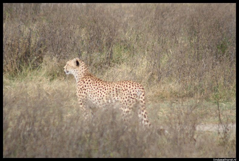 Vanmorgen om 6.00u de wekke, 6.30u ontbijt en stipt 7.00u reden we weg, op naar de krater! We zagen bovenop nog wat vrouwetjesolifanten, beneden leven alleen mannetjes omdat er niet genoeg eten is voor allemaal. De mannetjes komen alleen naar boven om te paren. Als eerste in de krater zagen we een kudde buffels, wat lijken dat toch een slome beesten. Vlak erna sloegen we rechtsaf toen Julio ons terug riep, een leeuwin met welpjes! Hoo, wij weer in de achteruit en eropaf. We zagen nog net hoe ze er eentje in haar bek nam en ze beide met zich meenam de greppel in, wow, dit was gaaf! Toen een hoop struisvogels, een aantal wildebeesten, een jakhals en wat thompson gazelles met wat warthogs. Genietend van het mooie uitzicht kwamen we nog een kori-bustard tegen. En toen dacht ik 2 leeuwinnen te zien, wij er op af, bleken het 2 jagende cheeta’s te zijn! Ze staken net de weg over toen wij aankwamen rijden en doken het hoge gras in, we zagen ze vanaf de achterkant een aanval opzetten. Bleek dat het om 2 jonge mannetjes ging die nog niet wisten dat een kudde gnoes helemaal geen mogelijkheid voor ze was, ze zijn veel te groot en waren te ver weg. Maar wat was dat gaaf om te zien, op een gegeven moment gingen ze samen op een heuveltje zitten en keken ze tegelijkertijd links, rechts en weer links, echt grappig! Daarna verdwenen ze en zagen wij een hoop wildebeesten en zebra’s drinken bij een rivier. In de verte een aantal hippo’s en flamingo’s in het meer. Even verderop lagen 5 leeuwinnen lekker te rusten en weer een endje verderop 3 leeuwinnen, waarvan er een aan het kluiven was op iets waarvan wij niet konden zien wat het was. Even verderop weer twee leeuwen waarbij de achterste in beweging kwam en met de voorste ging knuffelen, geweldig! Vrij snel daarna was de show alweer over en lieten ze zich weer op de zij vallen. Maar verderop zagen we alweer leeuwen en nu met een groot mannetje erbij, helaas had Mudi er niet echt de vaart in vandaag en was de leeuw alweer gaan liggen en konden we alleen zo zijn enorme manen bewonderen. Wat zouden we die toch graag eens rechtop zien, zo’n immens groot mannetje! Door dichtbegroeid bos speurend naar olifanten en neushoorns kwamen we aan bij de wc-stop. We stapten net onze jeep uit toen we zagen hoe de baboons bezit namen van een reeds geparkeerde jeep en alle tassen uitspitten op zoek naar eten. De buit was drie bananen en gillende vrouwen naast de jeep, haha. Wij heel hard lachen en snel ons dak dicht doen, zo ongelofelijk hoe snel die apen zijn! Na de korte pauze reden we weer verder en zagen we een hele kudde hippo’s rondom het water, omdat het hier niet warm is, zijn ze overdag op het land. Ervoor stonden een boel zebra’s wat het plaatje nog mooier maakte. Nog wat vogels, een groep pelikanen en in de verte een hartebeest gespot en ook zagen we weer 2 kori-bustards, nu hadden ze sprinkhanen gevangen. Verderop in een soort greppel dachten we eerst een leeuwin te zien liggen, bleek het een mega hyena te zijn, helemaal onder het bloed. Hmm die zal wel een grote kill hebben opgegeten denk ik en nu lag hij lekker voor pampus. In de verte zagen we nog een troep van zes leeuwinnen, maar ook deze lieten zich niet meer zien tegen de tijd dat wij er waren, ze lagen lekker in het hoge gras. Op weg terug naar de lodge zagen we de leeuwin met de 2 pups weer die ze nu goed verborgen hield. Terug bij de lodge konden we om 13.00u meteen aanschuiven voor de lunch, daar waren we wel aan toe na zo’n hele koude maar overweldigende ochtend vol met leeuwen en zelfs twee cheeta’s. Daarna doken we snel de zon in, wel uit de wind anders was het veel te koud en hebben we even gerelaxt. Daarna onder de douche weer opgewarmd en de spullen weer ingepakt. Ri zit lekker mee te zingen met haar I-Pod, nou het is echt geen gehoor, maar wel om te lachen, lekker bezig. Eten was gezellig maar niet echt lekker. We hebben in de bar wat gedronken met Keith en Cory, Ryan ging vroeg naar bed. Het was heel gezellig, weer veel gelachen. Onderweg naar de kamers weer geen melkweg te zien helaas, we werden gebracht door een man met een stok die de buffels voor ons op afstand moest houden… Hmmm dat klinkt wel gevaarlijk, het schijnt dat ze na 22.00u als het wat rustiger is bij de lodge hier komen grazen omdat ze het gras zo lekker vinden… Morgen op naar de laatste game drive, hopen dat we alles nog een keer zien! Het is 23.15u en we gaan snel slapen