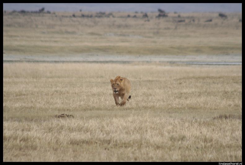 Vanmorgen om 8.00u zaten we weer in de jeep, op naar de laatste game drive in de Serengeti. De eerste tijd scheurden we overal langs totdat we een riviertje over moesten steken. Daar deden we drie keer over en aan de overkant van het meer zagen we links 4 leeuwinnen en rechts een heleboel wildebeesten. Helaas was er van beide kanten geen beweging en tuften wij verder. Nu zagen we nog meer wildebeesten bij elkaar en allemaal op weg naar de migratie, echt een overweldigend gezicht!! We hebben een tijdje tussen de duizenden wildebeesten rondgereden toen we weer om moesten keren naar het riviertje. Intussen waren de wildebeesten overgestoken en de leeuwinnen niet meer te zien. Wel zagen we een hoop gieren en een eenzame hyena die flink z’n best deed om alle gieren weg ta jagen, wat hem niet lukte in z’n eentje, het waren er teveel. Bij zo’n grote rots zagen we 2 jeeps staan, dat beloofde goed nieuws. En jawel, wat een geluk, 1 leeuw en 4 leeuwinnen waarvan er 1 zelfs zwanger was! Ze lagen (wederom) rustig te liggen, af en toe ging er een pootje of een kop omhoog maar dat was dan ook wel waar het bij bleef. Toen door naar de uitgang van het NP welke meteen over ging in het Ngorongoro NP. Bij de ingang konden we weer van een opperbest toilet genieten. Maar gelukkig ook hier een prachtig uitzicht over de vlaktes. Eenmaal terug bij de jeeps bleek er van de derde jeep de ventilator te zijn gesneuveld en moesten we die jeep achterlaten, de passagiers en de tassen werden over onze 2 jeeps. Na een tijdje door ‘skelettenland’ te hebben gereden, stopten we bij 1 duin ergens in de middle of nowhere. Weer pech, maar nu met de jeep van Julio, een lekke band. We zijn het duin opgeklommen, gezellig gekletst en een paar leuke foto’s gemaakt. Toen weer op weg en nog geen 20minuten later, weer de jeeps aan de kant, weer een lekke band! Dus weer uit de jeeps, kletsen in de zon, nieuwe band eronder, maar deze was ook al zacht, nou ja, op hoop van zegen. Zodra we hier uitstapten kwam er een Masai vrouw op ons af met 2 ezels, ze vroeg geld in ruil voor foto’s. Het land waar we ons nu bevinden is de ‘gorge’ waar de eerste mens gevonden (homo Sapiens) is en wordt alleen bewoond door de Masai, het is te dor en te droog om goed bewoond te kunnen worden. We reden na het verwisselen van de band door naar een uitkijkpunt over de vallei en hadden ook hier weer een schitterend uitzicht en een hoop lol met de amerikanen! De chauffeurs waren weer met de auto’s bezig en na een uurtje zat alles weer vast en konden we weer op pad. Nu gingen we door het lege landschap op weg naar een Masai-dorp. We werden verwelkomt met dans en zang en gingen in groepjes van 3 een hutje van binnen bekijken. Interessant hoor, we kregen uitleg over het leven van de Masai. Daarna nog een rondleiding door het dorpje en langs de plaatselijke school waar ze de ‘Jambo-song’ voor ons zongen. Toen ik begon te tellen in het engels, maakten zij het af, echt goed! Inmiddels had ik een klein ventje aan de hand wat me niet meer los liet, hoewel z’n moeder ons overal volgde. Nog steeds met het jochie aan de hand liepen we terug naar het dorp, terug naar de jeep en de volgende rit vol stof. Als de moeder het jochie niet had gepakt, was ie zo met ons mee gelopen. 20 minuten later kwamen we de chauffeur tegen die we eerder deze dag hadden achtergelaten met een kapotte ventilator. Hij stond nu weer stil met de nieuwe ventilator in zijn handen, dus wij weer stoppen, de chauffeurs haalden alle tools weer tevoorschijn en gingen weer al schreeuwend tegen elkaar aan de bak om de wagen te fiksen. Na 40minuten konden we weer op weg, want hij deed het weer. Hij wilde nog geen passagiers meenemen, die mochten in onze jeeps blijven. Nou, toen was de jeep van Julio weer aan de beurt, er was een slangetje los geschoten. We gaan lekker vandaag! Nieuw slangetje erin, weer wat geklus en gedoe en we konden weer op pad. Alleen onze jeep rijdt nog zonder problemen, als je het raam wat er steeds uitvalt niet mee rekent dan, haha. We vervolgden een stoffige weg en Mudi gaf vol gas omhoog en toen werd ik wel wat ziek, maar gelukkig was de afleiding van de prachtige uitzichten daar. In het hotel een koude handdoek, een drankje en de sleutel van een immens grote kamer met glazen serre met uitzicht op… een berg gras! Haha, geweldig! Lekker wat gedronken in de bar, koud gedoucht, alle apparatuur weer opgeladen en richting het diner. Goed buffet en toen weer naar de bar met de Amerikaanse jongens. We hebben veel gekletst en gelachen om ons belachelijke engels en een potje gekaart. Toen de bar dichtging hebben we op hun kamer ze leren meppen, haha! Toen nog een spelletje bullshit gespeeld waarbij ik wonderbaarlijk won zonder precies te weten hoe ik dat gedaan had, was het tijd om te slapen. Morgen naar de krater!