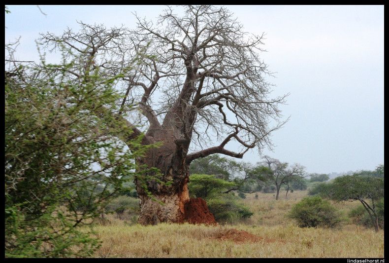 Lekker geslapen en ontbeten. Het is nog steeds erg koud en we stapten snel de jeeps in. De weg de krater uit was een stuk(je) beter dan de heenweg, gelukkig. Eenmaal uit het park werd het een asfaltweg en kregen we een mooi uitzicht over de nog steeds groene omgeving. Veel dorpjes en Masai lopend met hun koeien of geiten langs de weg. Rond het middaguur reden we Tarangire NP binnen en zagen we een mooi park met heel veel baobabbomen en een grote troep olifanten met kleintjes etend langs de weg. We zagen veel kapot gevreten bomen, zowel door olifanten als door termieten. We stopten bij een view-point waar we mooi uitzicht hadden over de vallei met een drooggevallen rivier. In de lunch kregen we een lunch en maakten we ons klaar om te zwemmen, maar helaas de zon verdween en het werd te koud. Toen hebben we de Amerikanen leren hartenjagen, was leuk. Om 16.00u vertrokken we voor onze laatste gamedrive. We zagen twee etende giraffen, gave beesten zijn dat toch. Toen een groepje olifanten wat net de weg overgestoken was, helemaal onder de rode stof. Even verderop weer een grote troep olifanten, ook weer met kleintjes erbij. Een moeder met een kleintje stond op de weg en schudde een paar keer met haar kop, gooide met zand en tetterde naar ons. Ook rende ze nog een paar stappen in onze richting, ohoh, wegwezen! Klein stukje achteruit gereden en weer staan kijken, ze bleef ons continu boos aankijken en liep de bosjes in. Daar tetterde ze nog een keer en hield ze ons in de gaten. Toen staken ze allemaal de weg over, wel 30 olifanten zagen we passeren. We reden een stukje verder en vlak achter de andere jeep was er weer een olifant boos geworden en schudde weer met de kop en nu tegen de achterste jeep, ze schrokken zich wezenloos, want de olifant was erg dichtbij en erg boos. Nu stonden wij voor ze en konden zij geen kant op, maar de chauffeurs hielden alles in de gaten. Wat een spektakel, echt geweldig! Toen alle olifanten de weg overgestoken waren, reden we weer een stukje verder en kwamen we weer een groep olifanten tegen. Ik maakte een foto waarbij ik de flits gebruikte en kreeg alweer getetter te horen en een boze blik, hmm ze zijn wel wat gepikeerd vandaag! Ook deze olifanten staken de weg over en hielden ons met boze blikken scherp in de gaten, brr wel heel gaaf maar ook een beetje eng was het wel. Later zagen we nog een paar dikdiks en een olifant in de verte. Langs de rivieroever zagen we nog twee leeuwinnen liggen, wat wel bijzonder was dat we die hier zagen; er zijn hier zoveel olifanten dat er bijna geen leeuwen zijn. Een schitterende sunset gezien, eindelijk! In de verte zagen we nog een groep olifanten en weer de leeuwinnen die lekker lagen te rollen in het zand. Terug in het hotel wat gedronken en elkaars foto’s bekeken, erg leuk om te zien hoe die jongens de ‘aanval’ van de olifant gezien hebben! Keith had een hele gave foto van de olifant op 3 meter afstand. Ook de foto’s uit Kenia heb ik nog gezien, daar hebben ze ook echt gave dingen beleefd, cheeta’s met een kill en een groepje neushoorns van heel dichtbij. De douche was lekker warm, het eten goed. In de bar hebben we gedronken, gekaart en gelachen. Het was een gezellige avond, tot in de late uurtjes…