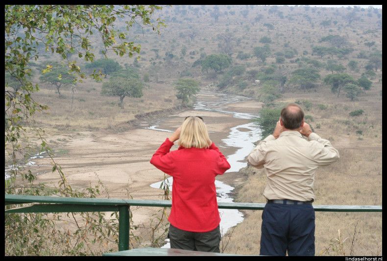 Op tijd ontbeten en stipt om 8.00u reden we richting Lake Manyara. Bij de ingang van het park werden we opgewacht door tientallen baboons. Eenmaal in het park werden we omringd door wel 1000 kleuren groen en vele vele baboons! Wat een ontzettend mooi en vooral groen park, het lijkt het tropische regenwoud van Ecuador wel. We zagen 2 mannetjes olifanten van een behoorlijke afstand en wederom baboons, vele soorten vogels, warthogs en impala’s. Na zo’n 2,5uur in het park gereden te hebben, reden we richting een picnic-place voor een sanitaire stop, maar vlak ervoor zagen we het schuwe luipaard hoog in een boom zitten. Wow, wat gaaf! Hij ging nog een paar keer verzitten en leek zich niet echt aan ons te storen, nu stonden we ook echt wel een eindje weg maar toch. Bij de stop een korte plaspauze en weer door. We kwamen weer langs het luipaard en hij lag nog steeds relaxt om zich heen te kijken. We kwamen langs de hippo-pool waar we een hoop ogen en oren boven het water zagen uitsteken en dat tussen allerlei soorten vogels. Om 12.00u waren we weer terug voor de lunch en om 13.00u vertrokken we naar de Serengeti. Onderweg zijn we alle kanten opgestuiterd door het slechte wegdek, echt ongelofelijk. Maar we hebben mooie dingen gezien; impala’s, warthogs, struisvogels, zebra’s en toen we binnen de grenzen van het park waren, zagen we nog een aantal gieren genieten van een kill. Dat was een geinig gezicht, allemaal stonden ze te wachten tot de grote baas uitgegeten was en toen de baas met veel vertoon wegliep, stormde de groep en op af en vocht om de laatste stukjes vlies, huid en haar, geweldig!  Inmiddels waren wij al verder gereden tot we werden teruggeroepen door de andere jeep van Julio. Ze hadden een leeuw gespot. Wij als een gek weer terug en het enige wat we zagen waren een heleboel manen, meer liet hij niet zien, jammer! Het gras was te hoog en hij lag te ver weg voor een mooie blik op z’n kop en lijf. Maar even later zagen we twee leeuwinnen lekker luieren in de zon, bovenop een groot rotsblok. Verder nog vele impala’s en wildebeesten gezien en nog een paar warthogs. En nog een gevlekte hyena en een black backed jackal, maar we konden niet te lang blijven staan, want we moesten voor het donker binnen zijn. Toen kwamen we een grote groep olifanten tegen, wow! En zo dichtbij! Opeens zeker te dichtbij want er begon er een te tetteren en met zijn kop te schudden, wegwezen! Toen ze voorbij waren gingen we volgas naar de lodge, waar we prachtig uitkeken over de eindeloze vlaktes. Het buffet smaakte weer goed, helaas eten we nergens plaatslijk wild. De vergunning daarvoor schijnt erg duur te zijn, helaas. Na het eten werden Ri en ik uitgenodigd door Keith, Cory en Ryan om gezellig wat te drinken in de bar, we hebben leuk gekletst. Zij komen uit St Louis en verhuizen komende maand alledrie naar New York, kijk, daar hebben we wat aan ;-). Om 23.30u liggen we in bed en maken ons klaar voor een full day game drive van morgen in de Serengeti.
