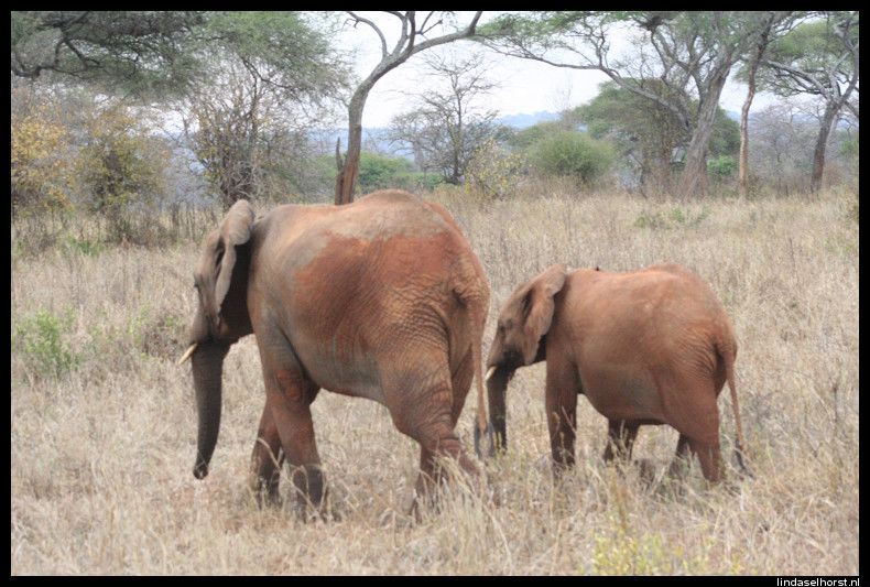 Lekker geslapen en ontbeten. Het is nog steeds erg koud en we stapten snel de jeeps in. De weg de krater uit was een stuk(je) beter dan de heenweg, gelukkig. Eenmaal uit het park werd het een asfaltweg en kregen we een mooi uitzicht over de nog steeds groene omgeving. Veel dorpjes en Masai lopend met hun koeien of geiten langs de weg. Rond het middaguur reden we Tarangire NP binnen en zagen we een mooi park met heel veel baobabbomen en een grote troep olifanten met kleintjes etend langs de weg. We zagen veel kapot gevreten bomen, zowel door olifanten als door termieten. We stopten bij een view-point waar we mooi uitzicht hadden over de vallei met een drooggevallen rivier. In de lunch kregen we een lunch en maakten we ons klaar om te zwemmen, maar helaas de zon verdween en het werd te koud. Toen hebben we de Amerikanen leren hartenjagen, was leuk. Om 16.00u vertrokken we voor onze laatste gamedrive. We zagen twee etende giraffen, gave beesten zijn dat toch. Toen een groepje olifanten wat net de weg overgestoken was, helemaal onder de rode stof. Even verderop weer een grote troep olifanten, ook weer met kleintjes erbij. Een moeder met een kleintje stond op de weg en schudde een paar keer met haar kop, gooide met zand en tetterde naar ons. Ook rende ze nog een paar stappen in onze richting, ohoh, wegwezen! Klein stukje achteruit gereden en weer staan kijken, ze bleef ons continu boos aankijken en liep de bosjes in. Daar tetterde ze nog een keer en hield ze ons in de gaten. Toen staken ze allemaal de weg over, wel 30 olifanten zagen we passeren. We reden een stukje verder en vlak achter de andere jeep was er weer een olifant boos geworden en schudde weer met de kop en nu tegen de achterste jeep, ze schrokken zich wezenloos, want de olifant was erg dichtbij en erg boos. Nu stonden wij voor ze en konden zij geen kant op, maar de chauffeurs hielden alles in de gaten. Wat een spektakel, echt geweldig! Toen alle olifanten de weg overgestoken waren, reden we weer een stukje verder en kwamen we weer een groep olifanten tegen. Ik maakte een foto waarbij ik de flits gebruikte en kreeg alweer getetter te horen en een boze blik, hmm ze zijn wel wat gepikeerd vandaag! Ook deze olifanten staken de weg over en hielden ons met boze blikken scherp in de gaten, brr wel heel gaaf maar ook een beetje eng was het wel. Later zagen we nog een paar dikdiks en een olifant in de verte. Langs de rivieroever zagen we nog twee leeuwinnen liggen, wat wel bijzonder was dat we die hier zagen; er zijn hier zoveel olifanten dat er bijna geen leeuwen zijn. Een schitterende sunset gezien, eindelijk! In de verte zagen we nog een groep olifanten en weer de leeuwinnen die lekker lagen te rollen in het zand. Terug in het hotel wat gedronken en elkaars foto’s bekeken, erg leuk om te zien hoe die jongens de ‘aanval’ van de olifant gezien hebben! Keith had een hele gave foto van de olifant op 3 meter afstand. Ook de foto’s uit Kenia heb ik nog gezien, daar hebben ze ook echt gave dingen beleefd, cheeta’s met een kill en een groepje neushoorns van heel dichtbij. De douche was lekker warm, het eten goed. In de bar hebben we gedronken, gekaart en gelachen. Het was een gezellige avond, tot in de late uurtjes…