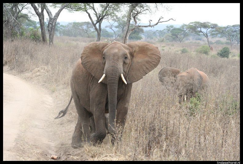 Lekker geslapen en ontbeten. Het is nog steeds erg koud en we stapten snel de jeeps in. De weg de krater uit was een stuk(je) beter dan de heenweg, gelukkig. Eenmaal uit het park werd het een asfaltweg en kregen we een mooi uitzicht over de nog steeds groene omgeving. Veel dorpjes en Masai lopend met hun koeien of geiten langs de weg. Rond het middaguur reden we Tarangire NP binnen en zagen we een mooi park met heel veel baobabbomen en een grote troep olifanten met kleintjes etend langs de weg. We zagen veel kapot gevreten bomen, zowel door olifanten als door termieten. We stopten bij een view-point waar we mooi uitzicht hadden over de vallei met een drooggevallen rivier. In de lunch kregen we een lunch en maakten we ons klaar om te zwemmen, maar helaas de zon verdween en het werd te koud. Toen hebben we de Amerikanen leren hartenjagen, was leuk. Om 16.00u vertrokken we voor onze laatste gamedrive. We zagen twee etende giraffen, gave beesten zijn dat toch. Toen een groepje olifanten wat net de weg overgestoken was, helemaal onder de rode stof. Even verderop weer een grote troep olifanten, ook weer met kleintjes erbij. Een moeder met een kleintje stond op de weg en schudde een paar keer met haar kop, gooide met zand en tetterde naar ons. Ook rende ze nog een paar stappen in onze richting, ohoh, wegwezen! Klein stukje achteruit gereden en weer staan kijken, ze bleef ons continu boos aankijken en liep de bosjes in. Daar tetterde ze nog een keer en hield ze ons in de gaten. Toen staken ze allemaal de weg over, wel 30 olifanten zagen we passeren. We reden een stukje verder en vlak achter de andere jeep was er weer een olifant boos geworden en schudde weer met de kop en nu tegen de achterste jeep, ze schrokken zich wezenloos, want de olifant was erg dichtbij en erg boos. Nu stonden wij voor ze en konden zij geen kant op, maar de chauffeurs hielden alles in de gaten. Wat een spektakel, echt geweldig! Toen alle olifanten de weg overgestoken waren, reden we weer een stukje verder en kwamen we weer een groep olifanten tegen. Ik maakte een foto waarbij ik de flits gebruikte en kreeg alweer getetter te horen en een boze blik, hmm ze zijn wel wat gepikeerd vandaag! Ook deze olifanten staken de weg over en hielden ons met boze blikken scherp in de gaten, brr wel heel gaaf maar ook een beetje eng was het wel. Later zagen we nog een paar dikdiks en een olifant in de verte. Langs de rivieroever zagen we nog twee leeuwinnen liggen, wat wel bijzonder was dat we die hier zagen; er zijn hier zoveel olifanten dat er bijna geen leeuwen zijn. Een schitterende sunset gezien, eindelijk! In de verte zagen we nog een groep olifanten en weer de leeuwinnen die lekker lagen te rollen in het zand. Terug in het hotel wat gedronken en elkaars foto’s bekeken, erg leuk om te zien hoe die jongens de ‘aanval’ van de olifant gezien hebben! Keith had een hele gave foto van de olifant op 3 meter afstand. Ook de foto’s uit Kenia heb ik nog gezien, daar hebben ze ook echt gave dingen beleefd, cheeta’s met een kill en een groepje neushoorns van heel dichtbij. De douche was lekker warm, het eten goed. In de bar hebben we gedronken, gekaart en gelachen. Het was een gezellige avond, tot in de late uurtjes…