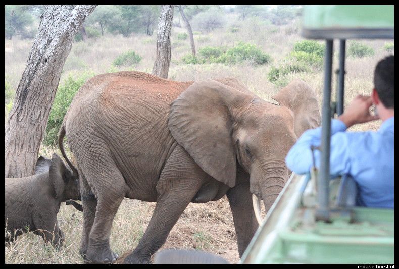 Lekker geslapen en ontbeten. Het is nog steeds erg koud en we stapten snel de jeeps in. De weg de krater uit was een stuk(je) beter dan de heenweg, gelukkig. Eenmaal uit het park werd het een asfaltweg en kregen we een mooi uitzicht over de nog steeds groene omgeving. Veel dorpjes en Masai lopend met hun koeien of geiten langs de weg. Rond het middaguur reden we Tarangire NP binnen en zagen we een mooi park met heel veel baobabbomen en een grote troep olifanten met kleintjes etend langs de weg. We zagen veel kapot gevreten bomen, zowel door olifanten als door termieten. We stopten bij een view-point waar we mooi uitzicht hadden over de vallei met een drooggevallen rivier. In de lunch kregen we een lunch en maakten we ons klaar om te zwemmen, maar helaas de zon verdween en het werd te koud. Toen hebben we de Amerikanen leren hartenjagen, was leuk. Om 16.00u vertrokken we voor onze laatste gamedrive. We zagen twee etende giraffen, gave beesten zijn dat toch. Toen een groepje olifanten wat net de weg overgestoken was, helemaal onder de rode stof. Even verderop weer een grote troep olifanten, ook weer met kleintjes erbij. Een moeder met een kleintje stond op de weg en schudde een paar keer met haar kop, gooide met zand en tetterde naar ons. Ook rende ze nog een paar stappen in onze richting, ohoh, wegwezen! Klein stukje achteruit gereden en weer staan kijken, ze bleef ons continu boos aankijken en liep de bosjes in. Daar tetterde ze nog een keer en hield ze ons in de gaten. Toen staken ze allemaal de weg over, wel 30 olifanten zagen we passeren. We reden een stukje verder en vlak achter de andere jeep was er weer een olifant boos geworden en schudde weer met de kop en nu tegen de achterste jeep, ze schrokken zich wezenloos, want de olifant was erg dichtbij en erg boos. Nu stonden wij voor ze en konden zij geen kant op, maar de chauffeurs hielden alles in de gaten. Wat een spektakel, echt geweldig! Toen alle olifanten de weg overgestoken waren, reden we weer een stukje verder en kwamen we weer een groep olifanten tegen. Ik maakte een foto waarbij ik de flits gebruikte en kreeg alweer getetter te horen en een boze blik, hmm ze zijn wel wat gepikeerd vandaag! Ook deze olifanten staken de weg over en hielden ons met boze blikken scherp in de gaten, brr wel heel gaaf maar ook een beetje eng was het wel. Later zagen we nog een paar dikdiks en een olifant in de verte. Langs de rivieroever zagen we nog twee leeuwinnen liggen, wat wel bijzonder was dat we die hier zagen; er zijn hier zoveel olifanten dat er bijna geen leeuwen zijn. Een schitterende sunset gezien, eindelijk! In de verte zagen we nog een groep olifanten en weer de leeuwinnen die lekker lagen te rollen in het zand. Terug in het hotel wat gedronken en elkaars foto’s bekeken, erg leuk om te zien hoe die jongens de ‘aanval’ van de olifant gezien hebben! Keith had een hele gave foto van de olifant op 3 meter afstand. Ook de foto’s uit Kenia heb ik nog gezien, daar hebben ze ook echt gave dingen beleefd, cheeta’s met een kill en een groepje neushoorns van heel dichtbij. De douche was lekker warm, het eten goed. In de bar hebben we gedronken, gekaart en gelachen. Het was een gezellige avond, tot in de late uurtjes…