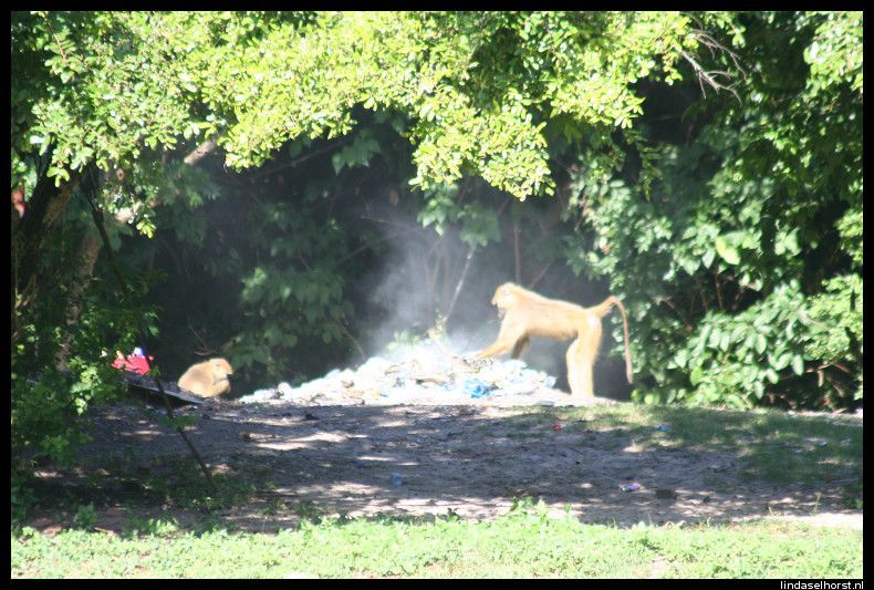 Op tijd ontbeten en stipt om 8.00u reden we richting Lake Manyara. Bij de ingang van het park werden we opgewacht door tientallen baboons. Eenmaal in het park werden we omringd door wel 1000 kleuren groen en vele vele baboons! Wat een ontzettend mooi en vooral groen park, het lijkt het tropische regenwoud van Ecuador wel. We zagen 2 mannetjes olifanten van een behoorlijke afstand en wederom baboons, vele soorten vogels, warthogs en impala’s. Na zo’n 2,5uur in het park gereden te hebben, reden we richting een picnic-place voor een sanitaire stop, maar vlak ervoor zagen we het schuwe luipaard hoog in een boom zitten. Wow, wat gaaf! Hij ging nog een paar keer verzitten en leek zich niet echt aan ons te storen, nu stonden we ook echt wel een eindje weg maar toch. Bij de stop een korte plaspauze en weer door. We kwamen weer langs het luipaard en hij lag nog steeds relaxt om zich heen te kijken. We kwamen langs de hippo-pool waar we een hoop ogen en oren boven het water zagen uitsteken en dat tussen allerlei soorten vogels. Om 12.00u waren we weer terug voor de lunch en om 13.00u vertrokken we naar de Serengeti. Onderweg zijn we alle kanten opgestuiterd door het slechte wegdek, echt ongelofelijk. Maar we hebben mooie dingen gezien; impala’s, warthogs, struisvogels, zebra’s en toen we binnen de grenzen van het park waren, zagen we nog een aantal gieren genieten van een kill. Dat was een geinig gezicht, allemaal stonden ze te wachten tot de grote baas uitgegeten was en toen de baas met veel vertoon wegliep, stormde de groep en op af en vocht om de laatste stukjes vlies, huid en haar, geweldig!  Inmiddels waren wij al verder gereden tot we werden teruggeroepen door de andere jeep van Julio. Ze hadden een leeuw gespot. Wij als een gek weer terug en het enige wat we zagen waren een heleboel manen, meer liet hij niet zien, jammer! Het gras was te hoog en hij lag te ver weg voor een mooie blik op z’n kop en lijf. Maar even later zagen we twee leeuwinnen lekker luieren in de zon, bovenop een groot rotsblok. Verder nog vele impala’s en wildebeesten gezien en nog een paar warthogs. En nog een gevlekte hyena en een black backed jackal, maar we konden niet te lang blijven staan, want we moesten voor het donker binnen zijn. Toen kwamen we een grote groep olifanten tegen, wow! En zo dichtbij! Opeens zeker te dichtbij want er begon er een te tetteren en met zijn kop te schudden, wegwezen! Toen ze voorbij waren gingen we volgas naar de lodge, waar we prachtig uitkeken over de eindeloze vlaktes. Het buffet smaakte weer goed, helaas eten we nergens plaatslijk wild. De vergunning daarvoor schijnt erg duur te zijn, helaas. Na het eten werden Ri en ik uitgenodigd door Keith, Cory en Ryan om gezellig wat te drinken in de bar, we hebben leuk gekletst. Zij komen uit St Louis en verhuizen komende maand alledrie naar New York, kijk, daar hebben we wat aan ;-). Om 23.30u liggen we in bed en maken ons klaar voor een full day game drive van morgen in de Serengeti.
