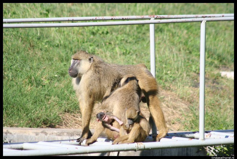 Op tijd ontbeten en stipt om 8.00u reden we richting Lake Manyara. Bij de ingang van het park werden we opgewacht door tientallen baboons. Eenmaal in het park werden we omringd door wel 1000 kleuren groen en vele vele baboons! Wat een ontzettend mooi en vooral groen park, het lijkt het tropische regenwoud van Ecuador wel. We zagen 2 mannetjes olifanten van een behoorlijke afstand en wederom baboons, vele soorten vogels, warthogs en impala’s. Na zo’n 2,5uur in het park gereden te hebben, reden we richting een picnic-place voor een sanitaire stop, maar vlak ervoor zagen we het schuwe luipaard hoog in een boom zitten. Wow, wat gaaf! Hij ging nog een paar keer verzitten en leek zich niet echt aan ons te storen, nu stonden we ook echt wel een eindje weg maar toch. Bij de stop een korte plaspauze en weer door. We kwamen weer langs het luipaard en hij lag nog steeds relaxt om zich heen te kijken. We kwamen langs de hippo-pool waar we een hoop ogen en oren boven het water zagen uitsteken en dat tussen allerlei soorten vogels. Om 12.00u waren we weer terug voor de lunch en om 13.00u vertrokken we naar de Serengeti. Onderweg zijn we alle kanten opgestuiterd door het slechte wegdek, echt ongelofelijk. Maar we hebben mooie dingen gezien; impala’s, warthogs, struisvogels, zebra’s en toen we binnen de grenzen van het park waren, zagen we nog een aantal gieren genieten van een kill. Dat was een geinig gezicht, allemaal stonden ze te wachten tot de grote baas uitgegeten was en toen de baas met veel vertoon wegliep, stormde de groep en op af en vocht om de laatste stukjes vlies, huid en haar, geweldig!  Inmiddels waren wij al verder gereden tot we werden teruggeroepen door de andere jeep van Julio. Ze hadden een leeuw gespot. Wij als een gek weer terug en het enige wat we zagen waren een heleboel manen, meer liet hij niet zien, jammer! Het gras was te hoog en hij lag te ver weg voor een mooie blik op z’n kop en lijf. Maar even later zagen we twee leeuwinnen lekker luieren in de zon, bovenop een groot rotsblok. Verder nog vele impala’s en wildebeesten gezien en nog een paar warthogs. En nog een gevlekte hyena en een black backed jackal, maar we konden niet te lang blijven staan, want we moesten voor het donker binnen zijn. Toen kwamen we een grote groep olifanten tegen, wow! En zo dichtbij! Opeens zeker te dichtbij want er begon er een te tetteren en met zijn kop te schudden, wegwezen! Toen ze voorbij waren gingen we volgas naar de lodge, waar we prachtig uitkeken over de eindeloze vlaktes. Het buffet smaakte weer goed, helaas eten we nergens plaatslijk wild. De vergunning daarvoor schijnt erg duur te zijn, helaas. Na het eten werden Ri en ik uitgenodigd door Keith, Cory en Ryan om gezellig wat te drinken in de bar, we hebben leuk gekletst. Zij komen uit St Louis en verhuizen komende maand alledrie naar New York, kijk, daar hebben we wat aan ;-). Om 23.30u liggen we in bed en maken ons klaar voor een full day game drive van morgen in de Serengeti.